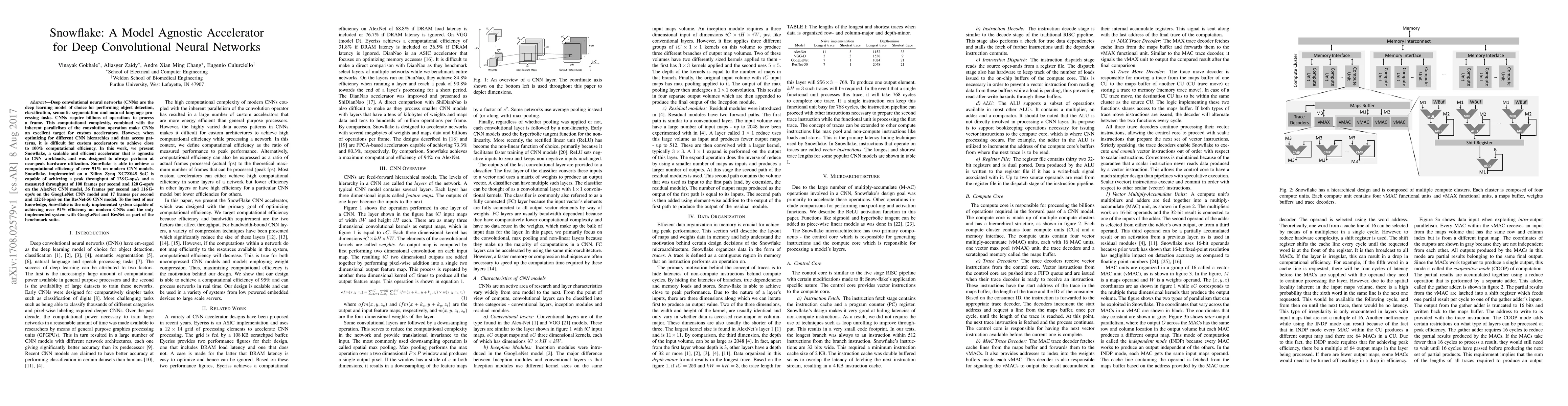 Deep convolutional neural networks (CNNs) are the deep learning model of choice for performing object detection, classification, semantic segmentation and natural language processing tasks. CNNs require billions of operations to process a frame. This computational complexity, combined with the inherent parallelism of the convolution operation make CNNs an excellent target for custom accelerators. However, when optimizing for different CNN hierarchies and data access patterns, it is difficult for custom accelerators to achieve close to 100% computational efficiency. In this work, we present Snowflake, a scalable and efficient accelerator that is agnostic to CNN workloads, and was designed to always perform at near-peak hardware utilization. Snowflake is able to achieve a computational efficiency of over 91% on modern CNN models. Snowflake, implemented on a Xilinx Zynq XC7Z045 SoC is capable of achieving a peak throughput of 128G-ops/s and a measured throughput of 100 frames per second and 120 G-ops/s on the AlexNet CNN model, 36 frames per second and 116G- ops/s on the GoogLeNet CNN model and 17 frames per second and 122 G-ops/s on the ResNet-50 CNN model. To the best of our knowledge, Snowflake is the only implemented system capable of achieving over 91% efficiency on modern CNNs and the only implemented system with GoogLeNet and ResNet as part of the benchmark suite.