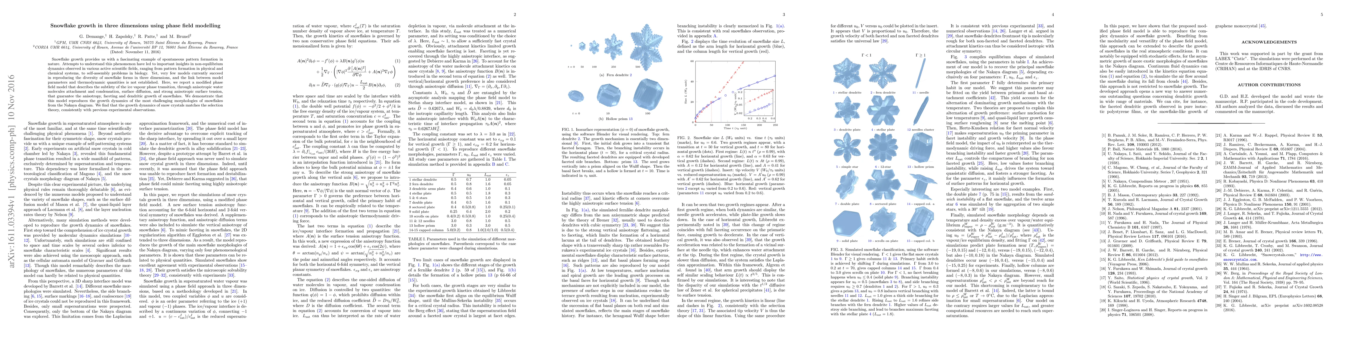 Snowflake growth provides us with a fascinating example of spontaneous pattern formation in nature. Attempts to understand this phenomenon have led to important insights in non-equilibrium dynamics observed in various active scientific fields, ranging from pattern formation in physical and chemical systems, to self-assembly problems in biology. Yet, very few models currently succeed in reproducing the diversity of snowflake forms in three dimensions, and the link between model parameters and thermodynamic quantities is not established. Here, we report a modified phase field model that describes the subtlety of the ice vapour phase transition, through anisotropic water molecules attachment and condensation, surface diffusion, and strong anisotropic surface tension, that guarantee the anisotropy, faceting and dendritic growth of snowflakes. We demonstrate that this model reproduces the growth dynamics of the most challenging morphologies of snowflakes from the Nakaya diagram. We find that the growth dynamics of snow crystals matches the selection theory, consistently with previous experimental observations.