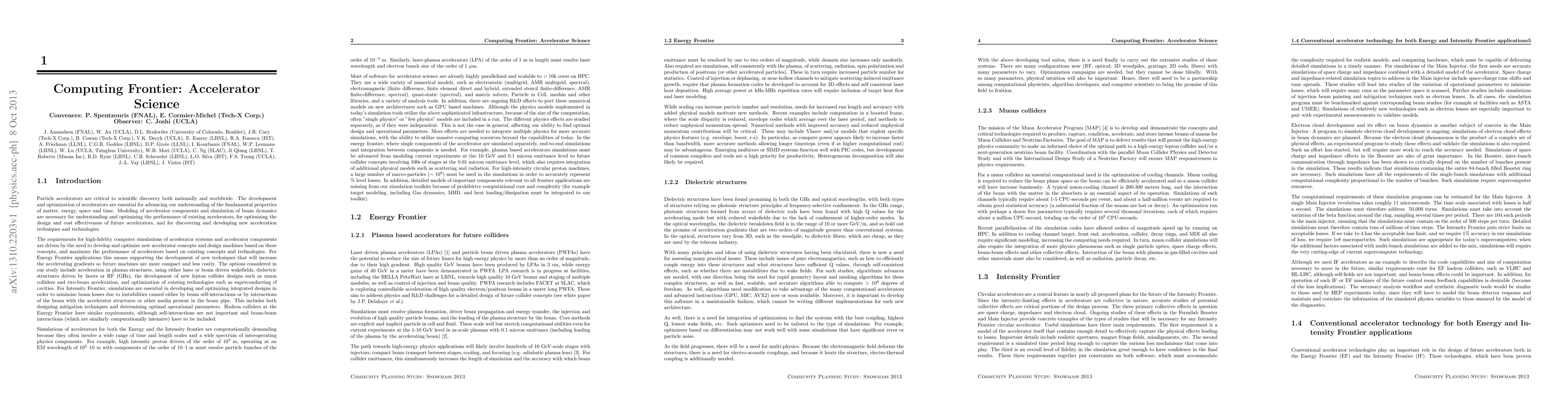 Summary: The Snowmass 2013 Computing Frontier report outlines the computing needs to advance accelerator technology in both Energy and Intensity Frontiers, emphasizing the importance of robust computational infrastructure for future accelerator projects.