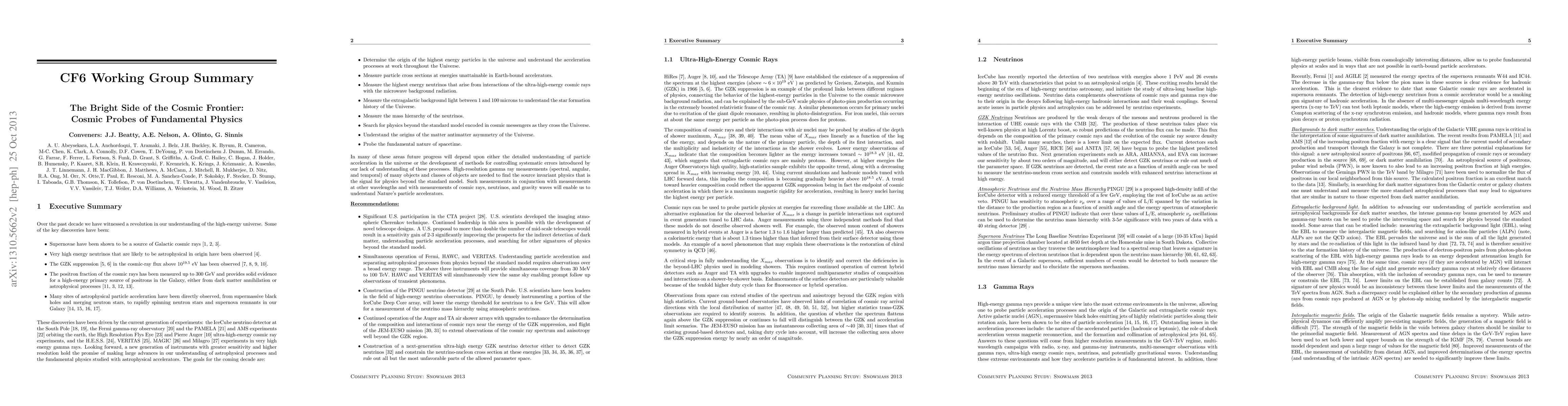 The Snowmass Cosmic Frontiers 6 (CF6) Working Group report explores ultra-high energy cosmic rays, neutrinos, gamma rays, and baryogenesis, alongside experiments investigating the fundamental nature of spacetime, aiming to probe the bright side of the cosmic frontier in fundamental physics.