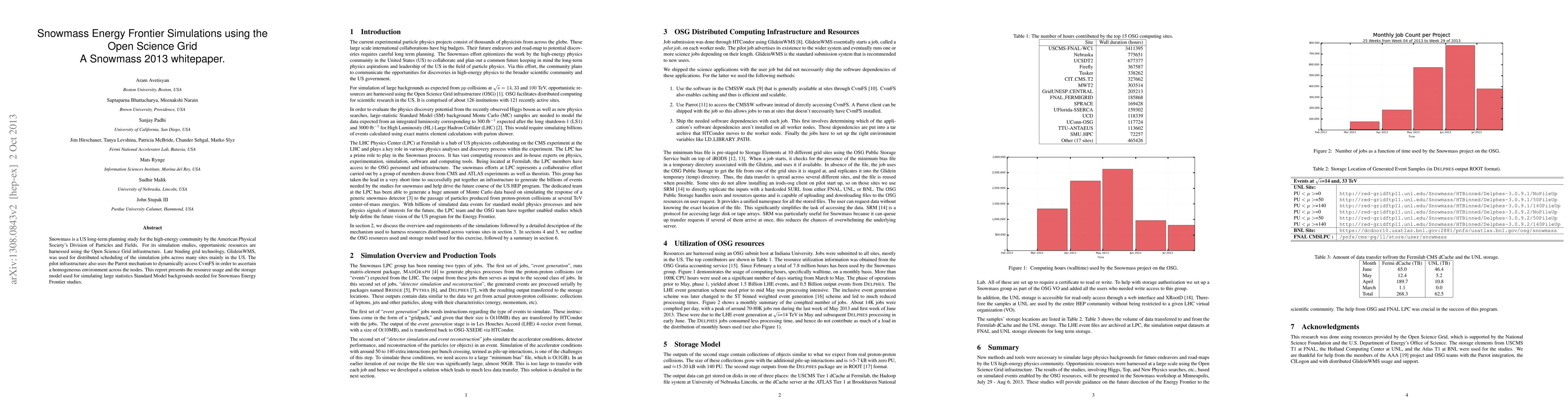 Snowmass is a US long-term planning study for the high-energy community by the American Physical Society's Division of Particles and Fields. For its simulation studies, opportunistic resources are harnessed using the Open Science Grid infrastructure. Late binding grid technology, GlideinWMS, was used for distributed scheduling of the simulation jobs across many sites mainly in the US. The pilot infrastructure also uses the Parrot mechanism to dynamically access CvmFS in order to ascertain a homogeneous environment across the nodes. This report presents the resource usage and the storage model used for simulating large statistics Standard Model backgrounds needed for Snowmass Energy Frontier studies.