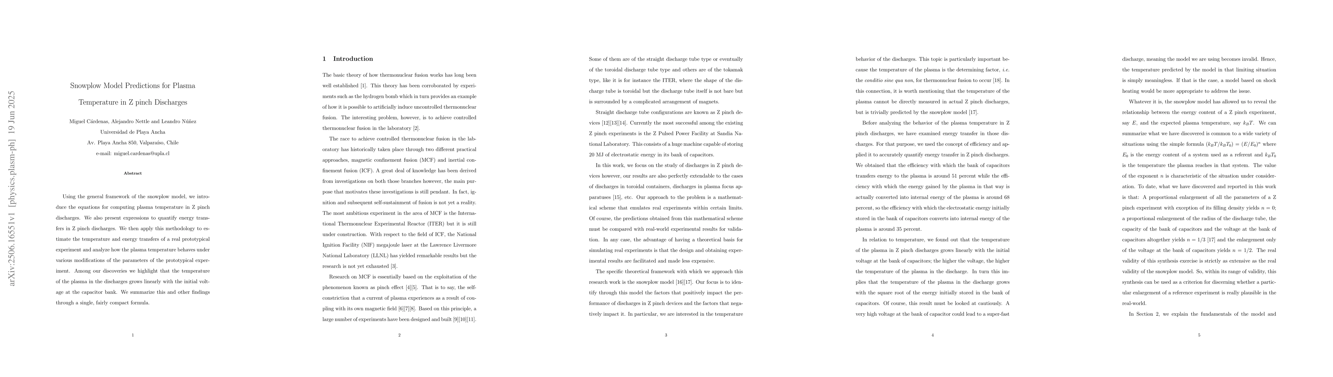 Using the general framework of the snowplow model, we introduce the equations for computing plasma temperature in Z pinch discharges. We also present expressions to quantify energy transfers in Z pinch discharges. We then apply this methodology to estimate the temperature and energy transfers of a real prototypical experiment and analyze how the plasma temperature behaves under various modifications of the parameters of the prototypical experiment. Among our discoveries we highlight that the temperature of the plasma in the discharges grows linearly with the initial voltage at the capacitor bank. We summarize this and other findings through a single, fairly compact formula.