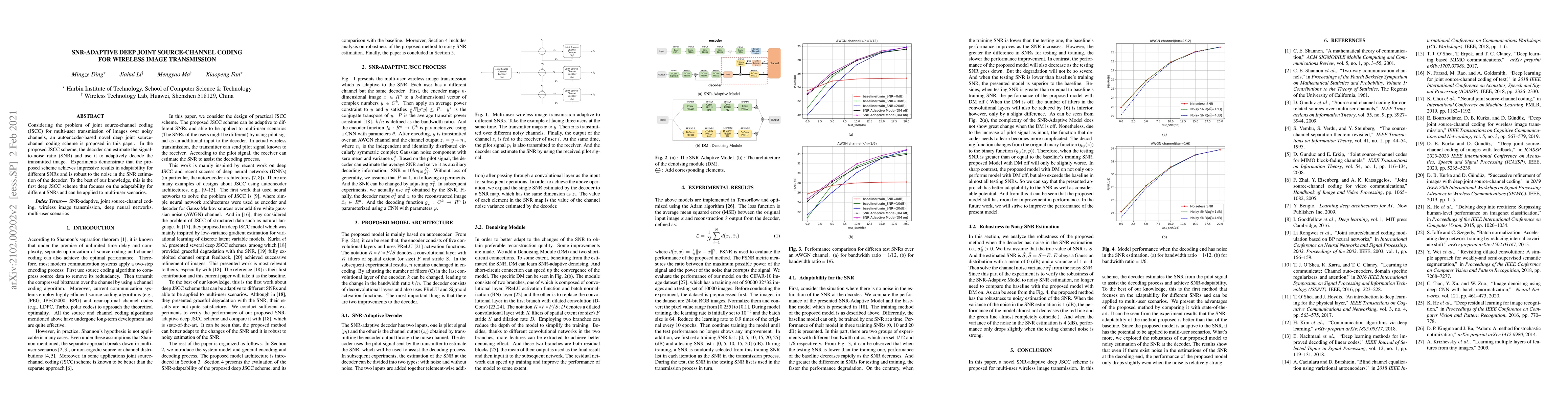 This paper proposes an autoencoder-based deep joint source-channel coding scheme for wireless image transmission that adapts to varying signal-to-noise ratios (SNRs). The scheme demonstrates adaptability and robustness, making it effective for multi-user scenarios.