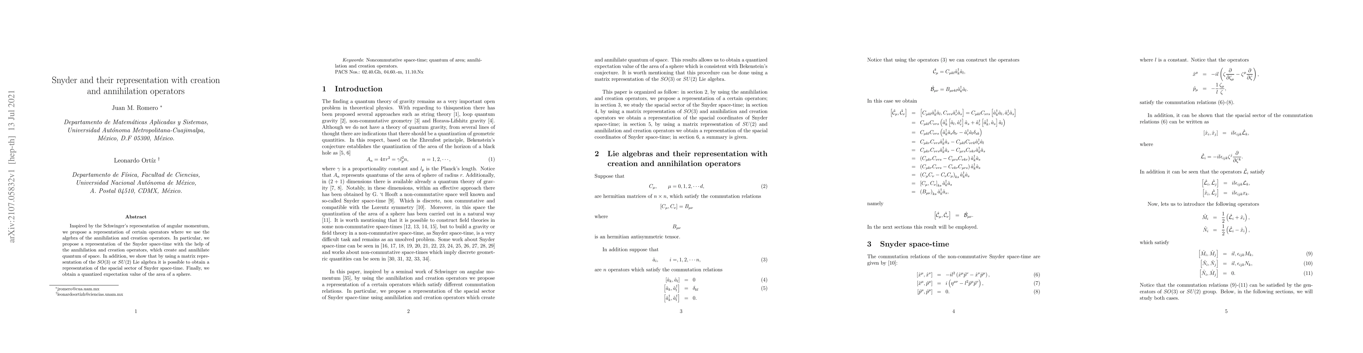 Inspired by the Schwinger's representation of angular momentum, we propose a representation of certain operators where we use the algebra of the annihilation and creation operators. In particular, we propose a representation of the Snyder space-time with the help of the annihilation and creation operators, which create and annihilate quantum of space. In addition, we show that by using a matrix representation of the $SO(3)$ or $SU(2)$ Lie algebra it is possible to obtain a representation of the spacial sector of Snyder space-time. Finally, we obtain a quantized expectation value of the area of a sphere.