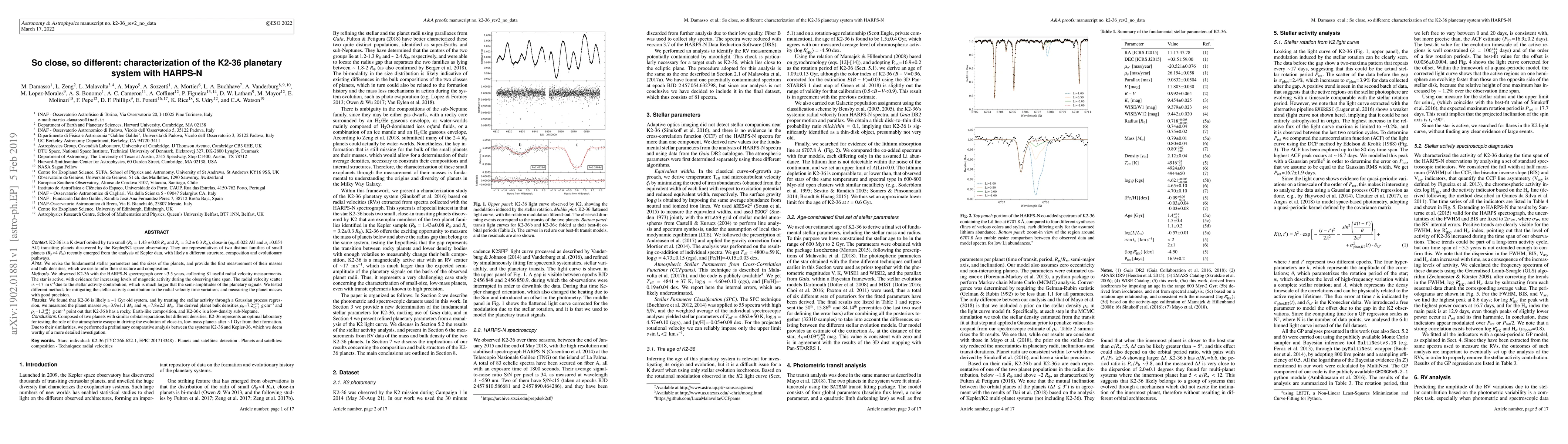 The K2-36 planetary system, observed with HARPS-N, consists of two small transiting planets with different densities and compositions. The study provides precise measurements of their masses and densities, revealing that K2-36 b is rocky, while K2-36 c is a low-density sub-Neptune, offering insights into atmospheric escape mechanisms in close-in, low-mass planets.