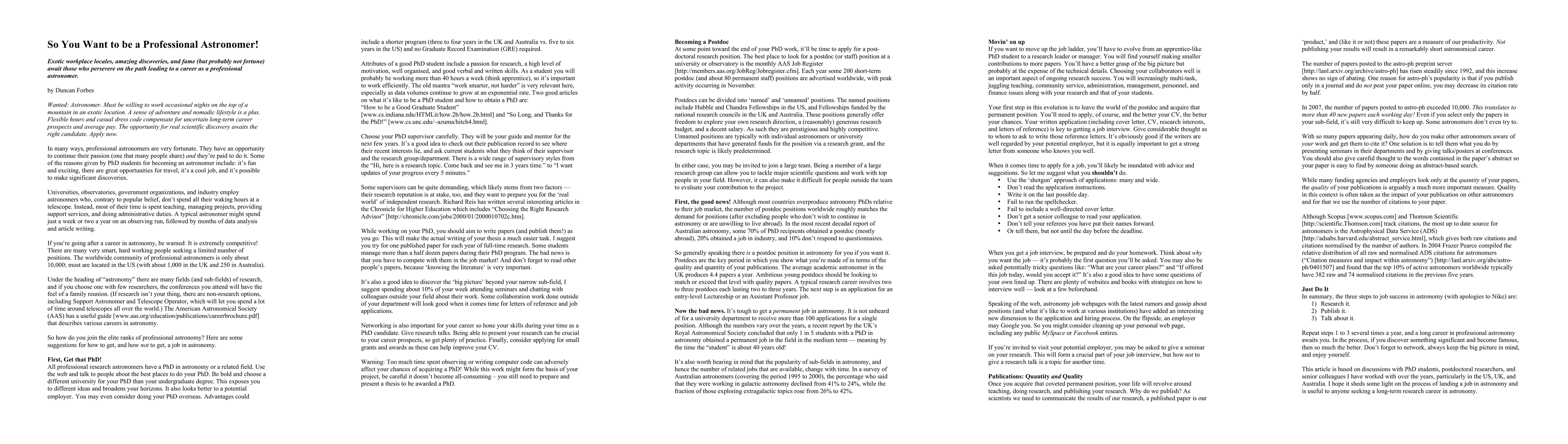 Summary: This paper outlines the journey to becoming a professional astronomer, highlighting the unique opportunities and challenges, and provides practical advice on how to secure a position in this esteemed field. It emphasizes perseverance, dedication, and the potential for groundbreaking discoveries.