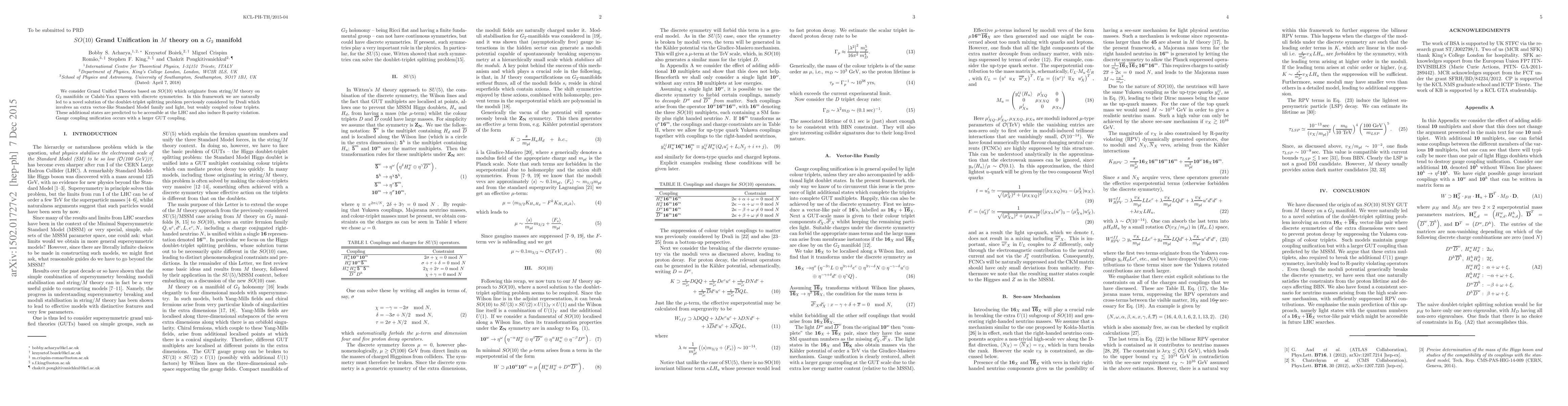 This paper explores $SO(10)$ Grand Unified Theories derived from M-theory on $G_2$ manifolds, proposing a solution to the doublet-triplet splitting problem with an extra vector-like Standard Model family and weakly coupled colour triplets, predicted to be detectable at the LHC and inducing R-parity violation. Gauge coupling unification is achieved with a higher GUT coupling constant.