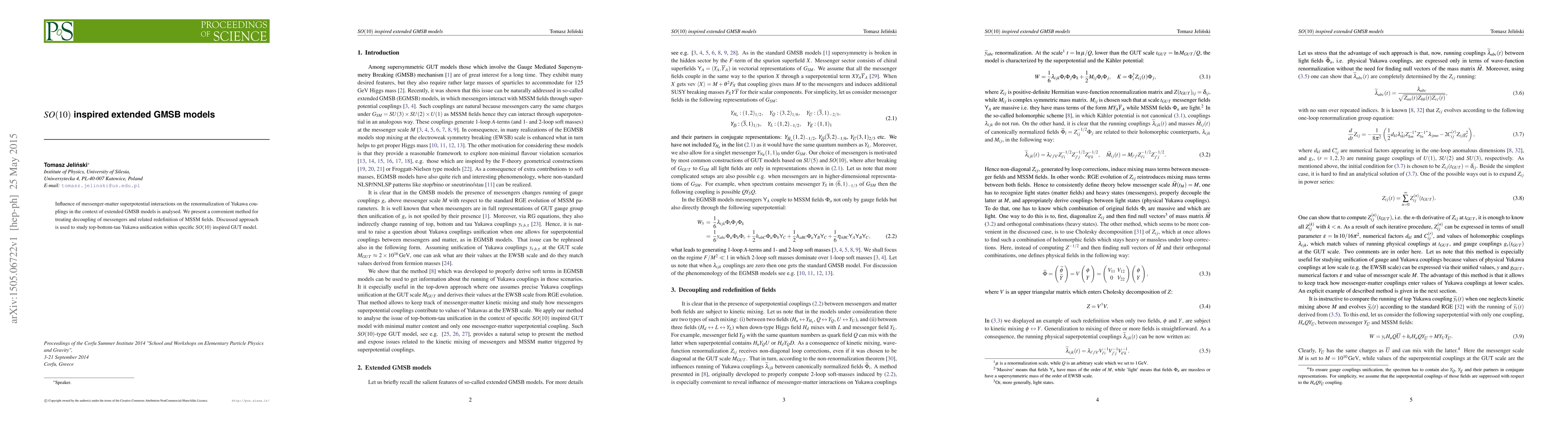 This paper analyzes the impact of messenger-matter superpotential interactions on Yukawa coupling renormalization in extended GMSB models, proposing a method for decoupling messengers and redefining MSSM fields. It applies this approach to achieve top-bottom-tau Yukawa unification within an $SO(10)$ inspired GUT model.