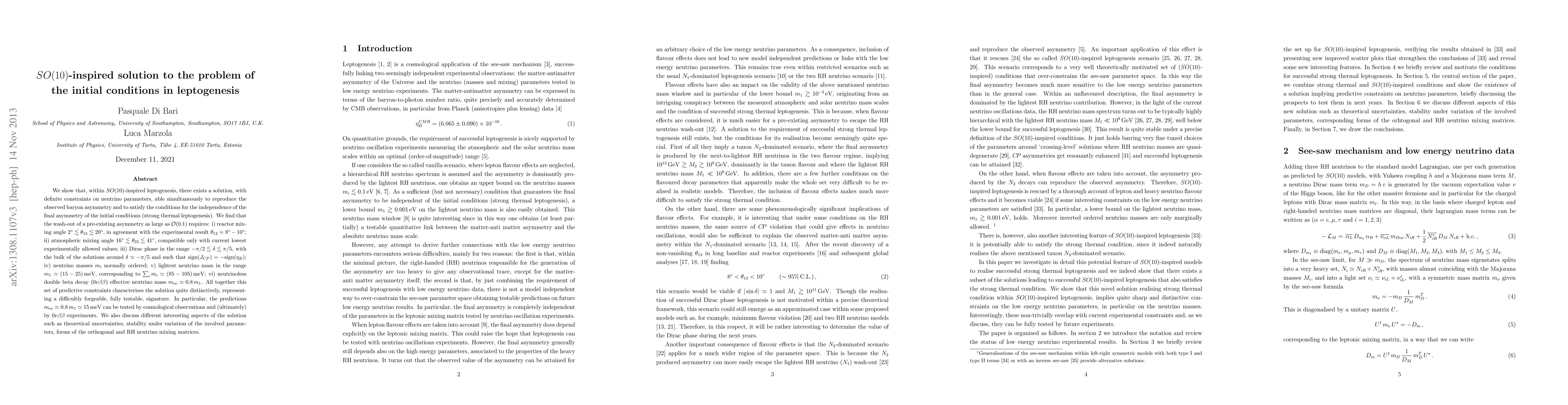 This research proposes an SO(10)-inspired solution for leptogenesis that reproduces observed baryon asymmetry while maintaining independence from initial conditions. It predicts specific ranges for low-energy neutrino parameters, including reactor and atmospheric mixing angles, Dirac phase, and neutrino masses, with implications for neutrinoless double beta decay and cosmological observations.