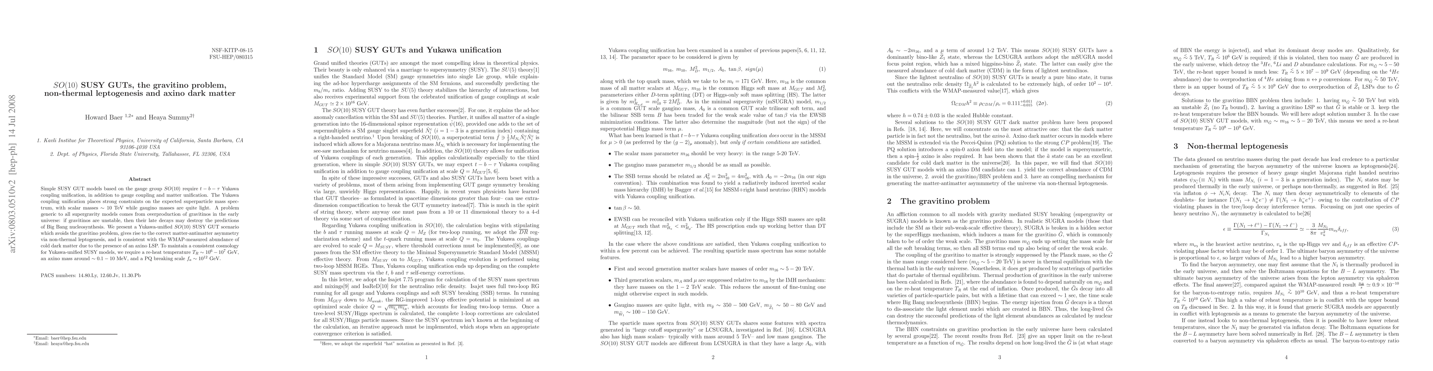 This paper proposes a Yukawa-unified SO(10) SUSY GUT model that addresses the gravitino problem, achieves non-thermal leptogenesis for matter asymmetry, and supports axino dark matter, requiring specific cosmological parameters for consistency.
