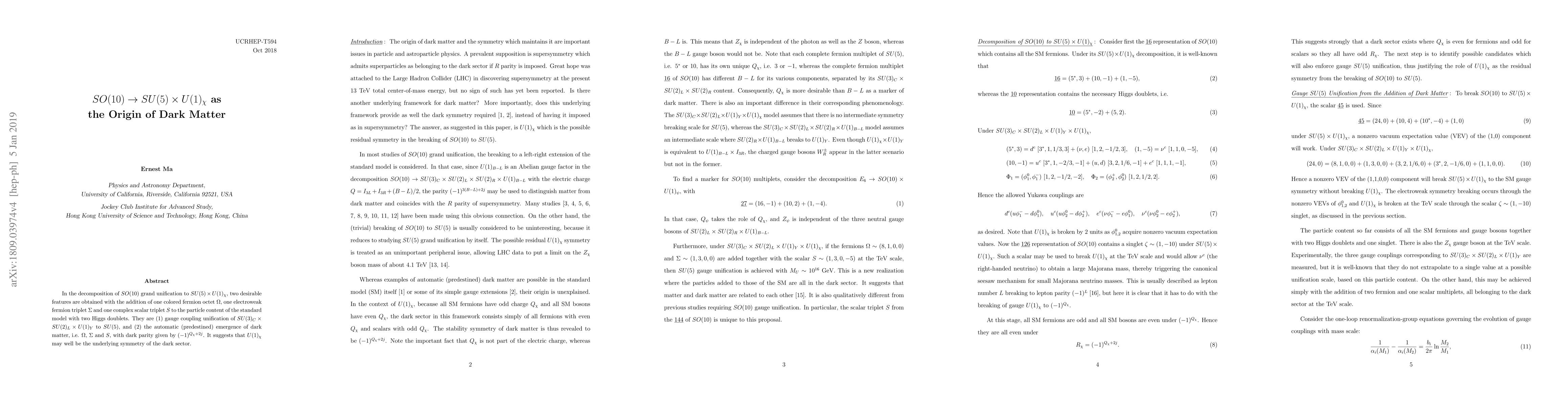This paper proposes $SO(10)$ grand unification decomposing to $SU(5) \times U(1)_\chi$, introducing particles that unify gauge couplings and naturally generate dark matter candidates ($\Omega$, $\Sigma$, $S$) with a defined dark parity, suggesting $U(1)_\chi$ as the dark sector symmetry.