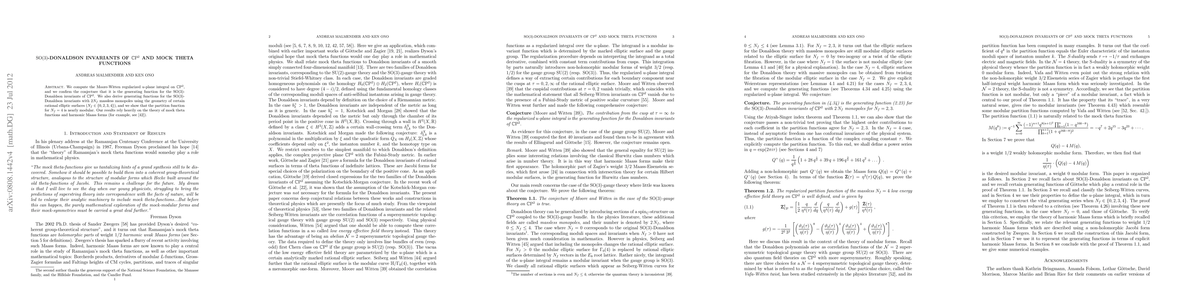 This paper computes the Moore-Witten u-plane integral on CP^2, confirming it as the generating function for SO(3)-Donaldson invariants using mock theta functions. It also derives generating functions for invariants with monopoles and shows a nearly modular partition function for N_f=4, leading to a weight 1/2 modular form.