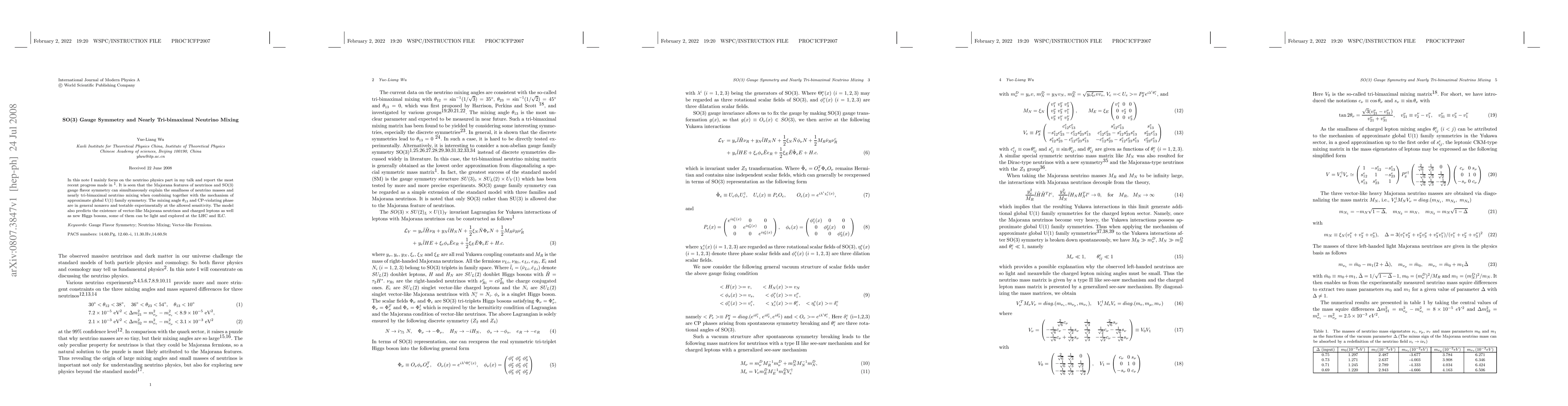 In this note I mainly focus on the neutrino physics part in my talk and report the most recent progress made in \cite{YLW0}. It is seen that the Majorana features of neutrinos and SO(3) gauge flavor symmetry can simultaneously explain the smallness of neutrino masses and nearly tri-bimaximal neutrino mixing when combining together with the mechanism of approximate global U(1) family symmetry. The mixing angle $\theta_{13}$ and CP-violating phase are in general nonzero and testable experimentally at the allowed sensitivity. The model also predicts the existence of vector-like Majorana neutrinos and charged leptons as well as new Higgs bosons, some of them can be light and explored at the LHC and ILC.