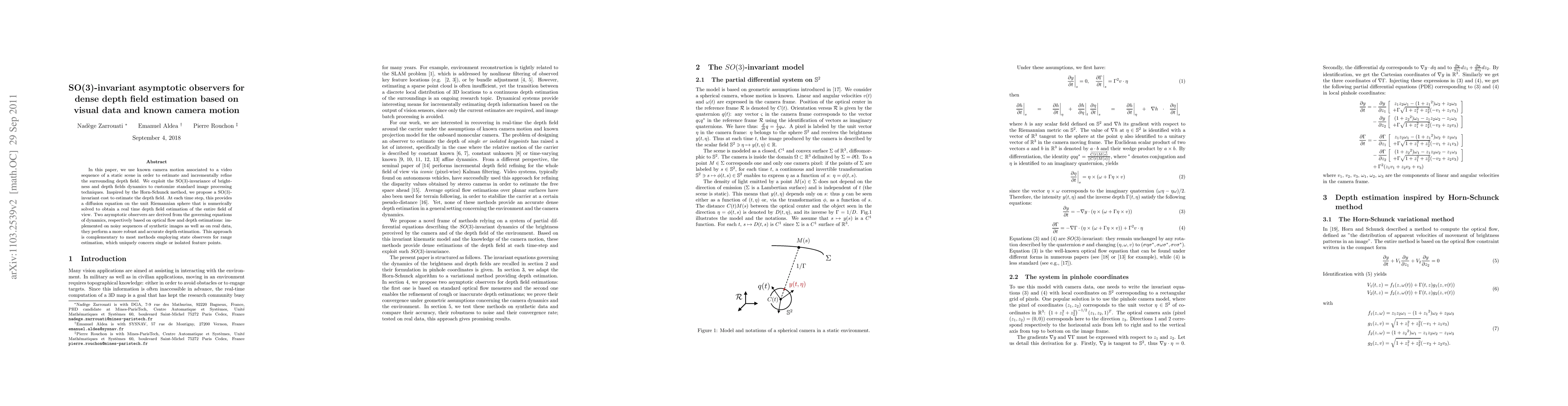 In this paper, we use known camera motion associated to a video sequence of a static scene in order to estimate and incrementally refine the surrounding depth field. We exploit the SO(3)-invariance of brightness and depth fields dynamics to customize standard image processing techniques. Inspired by the Horn-Schunck method, we propose a SO(3)-invariant cost to estimate the depth field. At each time step, this provides a diffusion equation on the unit Riemannian sphere that is numerically solved to obtain a real time depth field estimation of the entire field of view. Two asymptotic observers are derived from the governing equations of dynamics, respectively based on optical flow and depth estimations: implemented on noisy sequences of synthetic images as well as on real data, they perform a more robust and accurate depth estimation. This approach is complementary to most methods employing state observers for range estimation, which uniquely concern single or isolated feature points.