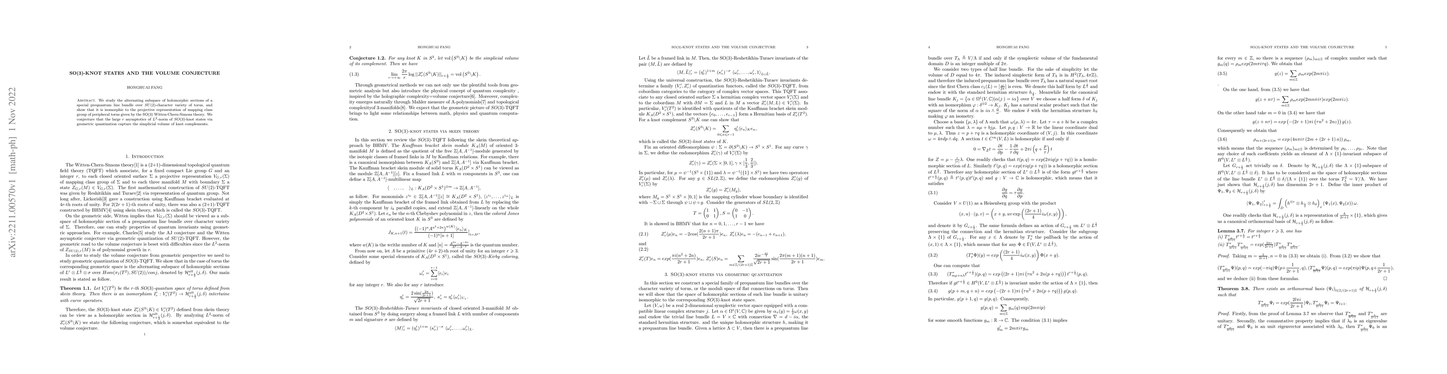 This paper investigates the alternating subspace of holomorphic sections of a prequantum line bundle over the SU(2)-character variety of a torus, establishing its isomorphism with the projective representation of the mapping class group from SO(3) Witten-Chern-Simons theory. The authors propose a conjecture linking the large r asymptotics of $L^2$-norms of SO(3)-knot states to the simplicial volume of knot complements.