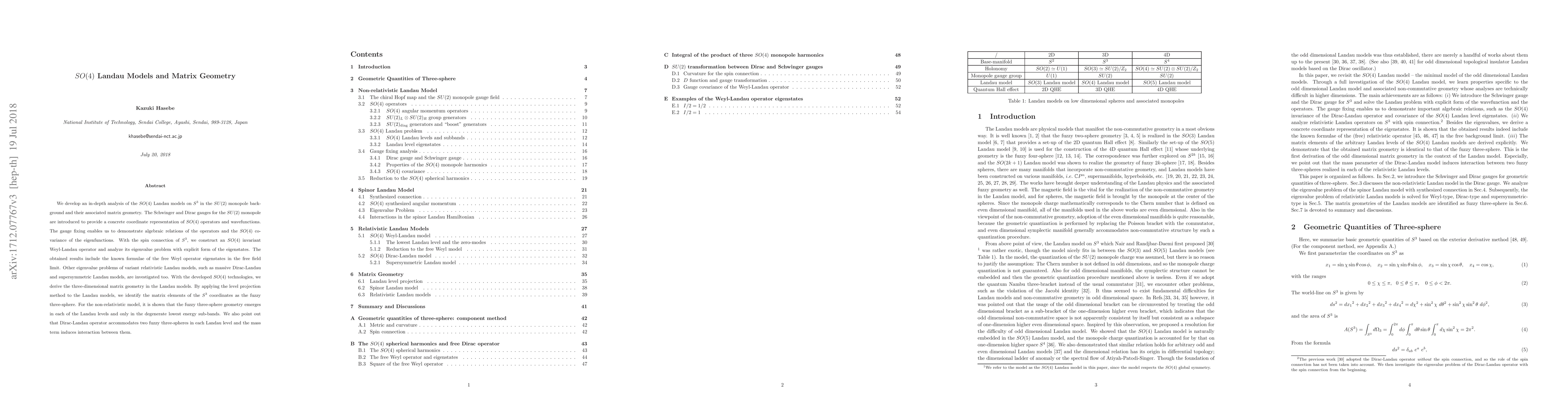 We develop an in-depth analysis of the $SO(4)$ Landau models on $S^3$ in the $SU(2)$ monopole background and their associated matrix geometry. The Schwinger and Dirac gauges for the $SU(2)$ monopole are introduced to provide a concrete coordinate representation of $SO(4)$ operators and wavefunctions. The gauge fixing enables us to demonstrate algebraic relations of the operators and the $SO(4)$ covariance of the eigenfunctions. With the spin connection of $S^3$, we construct an $SO(4)$ invariant Weyl-Landau operator and analyze its eigenvalue problem with explicit form of the eigenstates. The obtained results include the known formulae of the free Weyl operator eigenstates in the free field limit. Other eigenvalue problems of variant relativistic Landau models, such as massive Dirac-Landau and supersymmetric Landau models, are investigated too. With the developed $SO(4)$ technologies, we derive the three-dimensional matrix geometry in the Landau models. By applying the level projection method to the Landau models, we identify the matrix elements of the $S^3$ coordinates as the fuzzy three-sphere. For the non-relativistic model, it is shown that the fuzzy three-sphere geometry emerges in each of the Landau levels and only in the degenerate lowest energy sub-bands. We also point out that Dirac-Landau operator accommodates two fuzzy three-spheres in each Landau level and the mass term induces interaction between them.