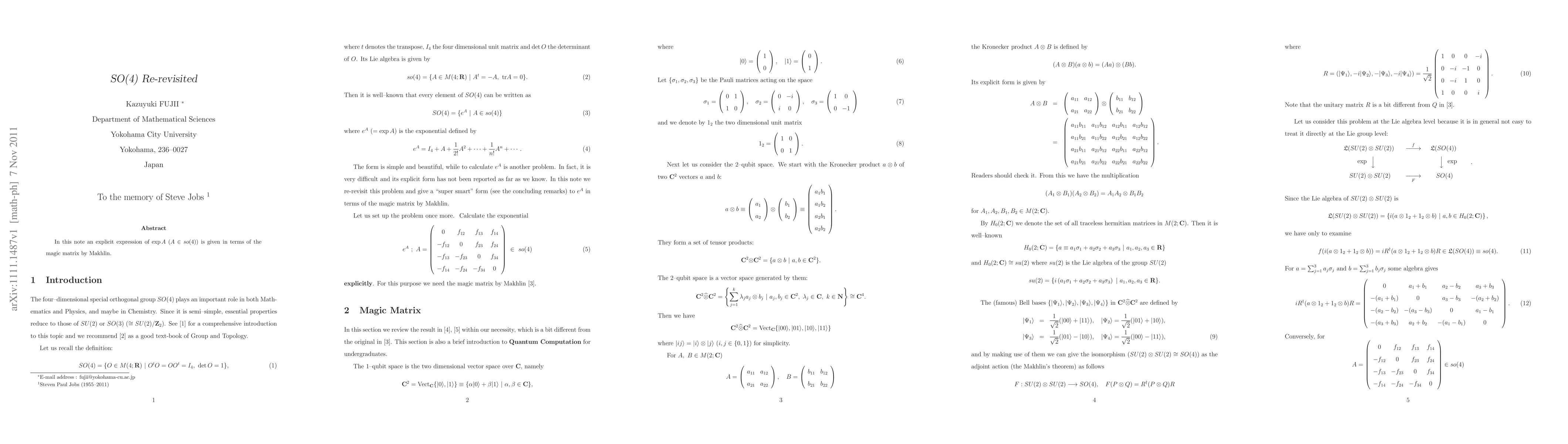 In this note an explicit expression of $\exp A\ (A\in so(4))$ is given in terms of the magic matrix by Makhlin.