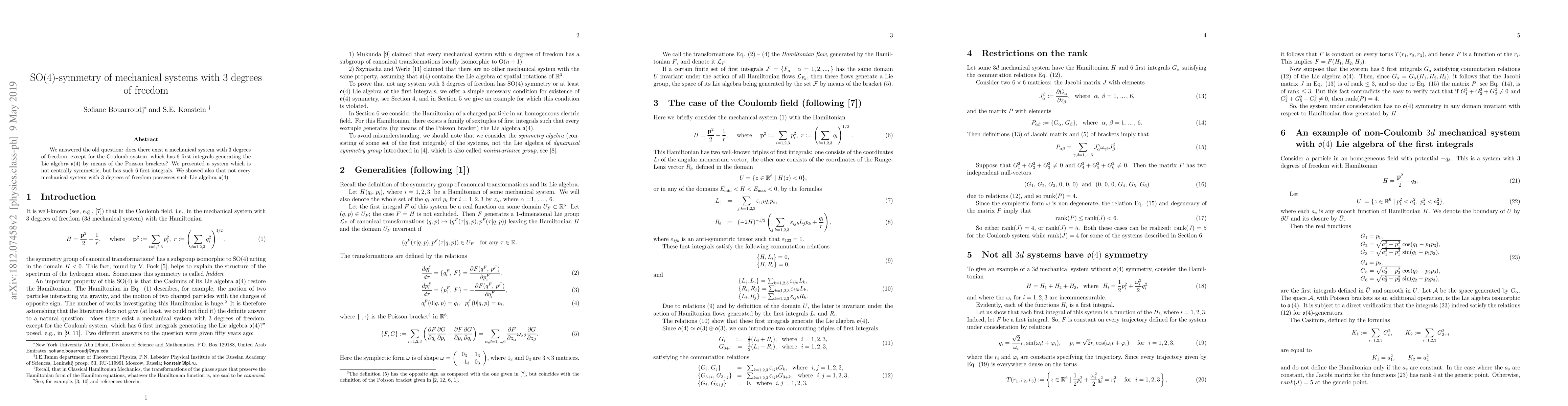 We answered the old question: does there exist a mechanical system with 3 degrees of freedom, except for the Coulomb system, which has 6 first integrals generating the Lie algebra o(4) by means of the Poisson brackets? We presented a system which is not centrally symmetric, but has such 6 first integrals. We showed also that not every mechanical system with 3 degrees of freedom possesses such Lie algebra o(4).