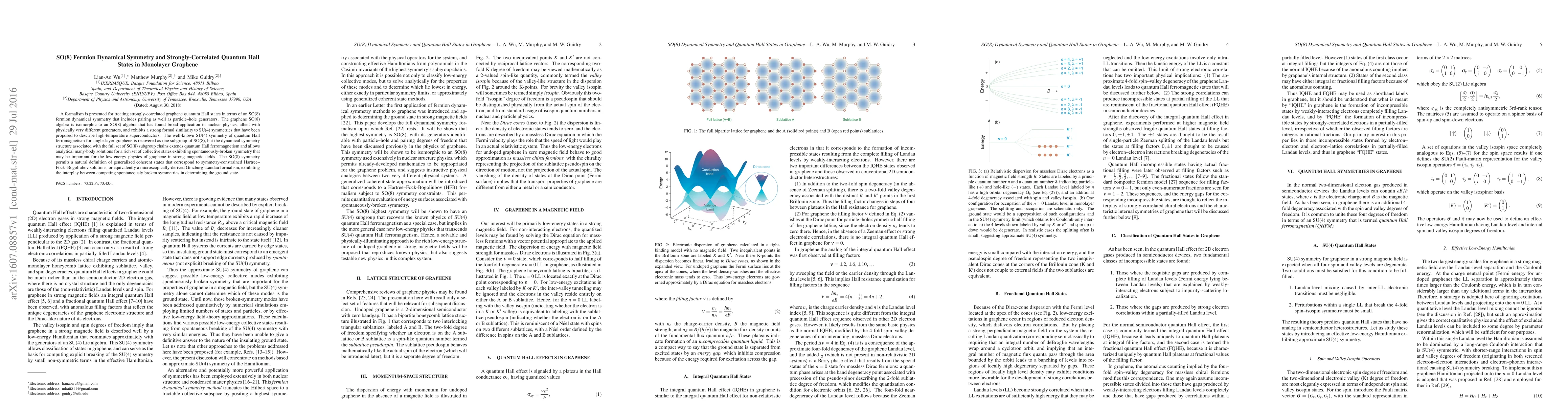 A formalism is presented for treating strongly-correlated graphene quantum Hall states in terms of an SO(8) fermion dynamical symmetry that includes pairing as well as particle--hole generators. The graphene SO(8) algebra is isomorphic to an SO(8) algebra that has found broad application in nuclear physics, albeit with physically very different generators, and exhibits a strong formal similarity to SU(4) symmetries that have been proposed to describe high-temperature superconductors. The well-known SU(4) symmetry of quantum Hall ferromagnetism for single-layer graphene is recovered as one subgroup of SO(8), but the dynamical symmetry structure associated with the full set of SO(8) subgroup chains extends quantum Hall ferromagnetism and allows analytical many-body solutions for a rich set of collective states exhibiting spontaneously-broken symmetry that may be important for the low-energy physics of graphene in strong magnetic fields. The SO(8) symmetry permits a natural definition of generalized coherent states that correspond to symmetry-constrained Hartree--Fock--Bogoliubov solutions, or equivalently a microscopically-derived Ginzburg--Landau formalism, exhibiting the interplay between competing spontaneously broken symmetries in determining the ground state.