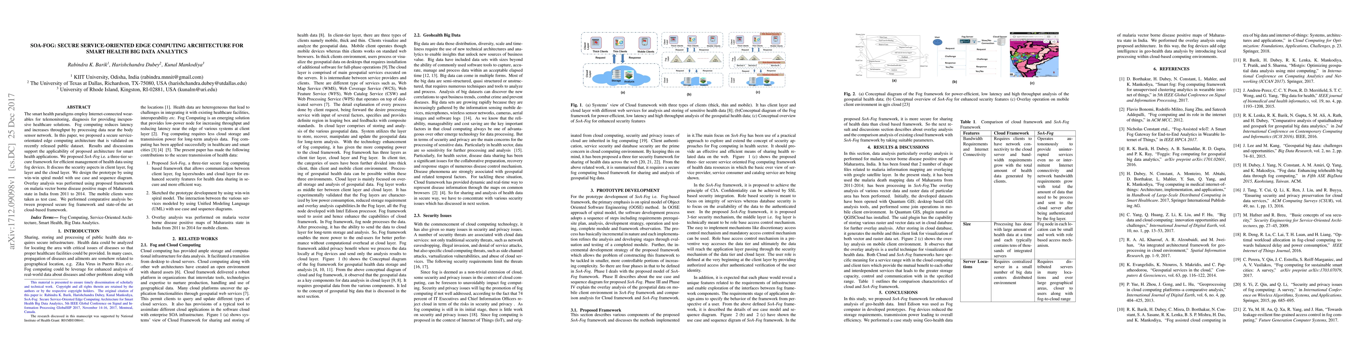 The smart health paradigms employ Internet-connected wearables for telemonitoring, diagnosis for providing inexpensive healthcare solutions. Fog computing reduces latency and increases throughput by processing data near the body sensor network. In this paper, we proposed a secure serviceorientated edge computing architecture that is validated on recently released public dataset. Results and discussions support the applicability of proposed architecture for smart health applications. We proposed SoA-Fog i.e. a three-tier secure framework for efficient management of health data using fog devices. It discuss the security aspects in client layer, fog layer and the cloud layer. We design the prototype by using win-win spiral model with use case and sequence diagram. Overlay analysis was performed using proposed framework on malaria vector borne disease positive maps of Maharastra state in India from 2011 to 2014. The mobile clients were taken as test case. We performed comparative analysis between proposed secure fog framework and state-of-the art cloud-based framework.