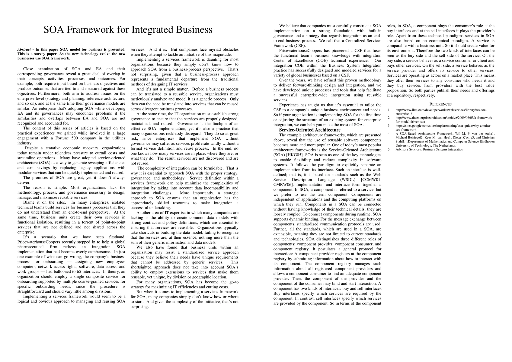 Summary: This paper surveys the adoption of the Service-Oriented Architecture (SOA) framework in modern business practices, highlighting its relevance as new technologies evolve and businesses integrate SOA to enhance operational efficiency.
