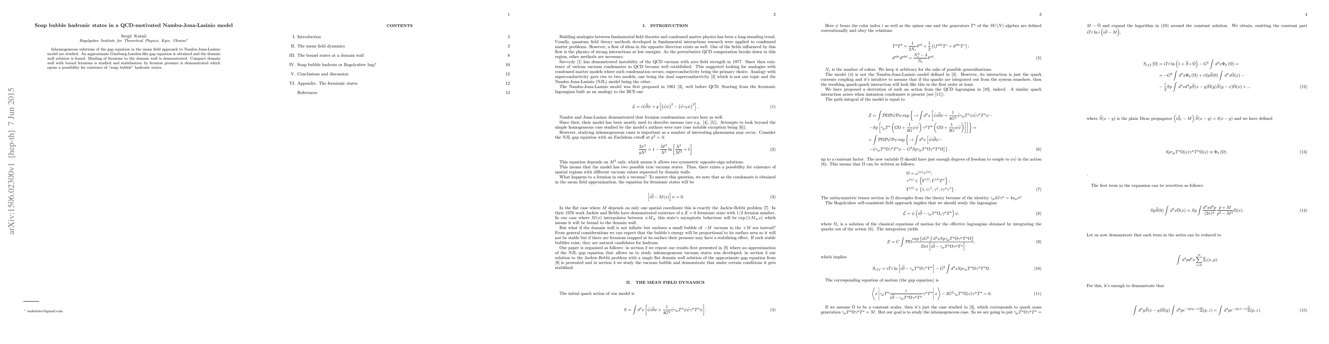 This paper investigates inhomogeneous solutions in a QCD-motivated Nambu-Jona-Lasinio model, discovering a domain wall solution and demonstrating fermion binding to it. The stabilization of compact domain walls by fermion pressure suggests the potential existence of "soap bubble" hadronic states.