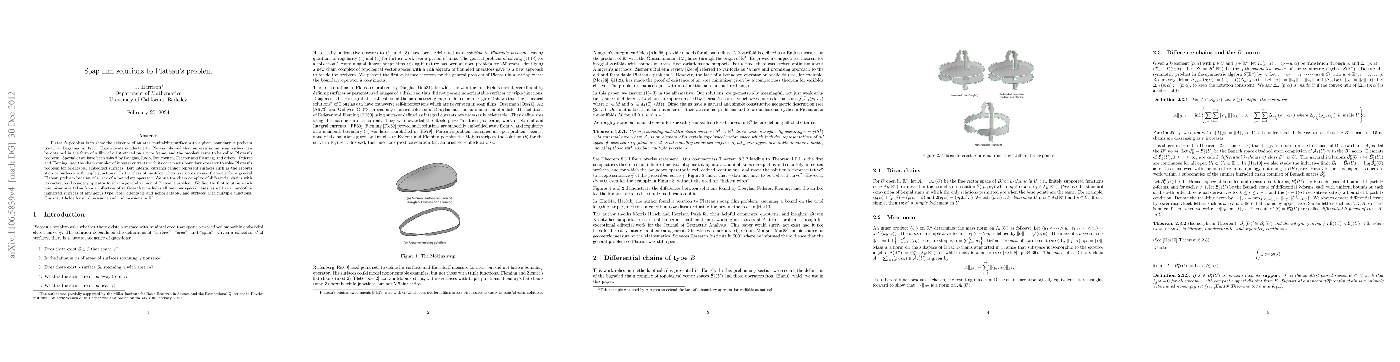 Plateau's problem is to show the existence of an area minimizing surface with a given boundary, a problem posed by Lagrange in 1760. Experiments conducted by Plateau showed that an area minimizing surface can be obtained in the form of a film of oil stretched on a wire frame, and the problem came to be called Plateau's problem. Special cases have been solved by Douglas, Rado, Besicovitch, Federer and Fleming, and others. Federer and Fleming used the chain complex of integral currents with its continuous boundary operator to solve Plateau's problem for orientable, embedded surfaces. But integral currents cannot represent surfaces such as the Moebius strip or surfaces with triple junctions. In the class of varifolds, there are no existence theorems for a general Plateau problem because of a lack of a boundary operator. We use the chain complex of differential chains with its continuous boundary operator to solve a general version of Plateau's problem. We find the first solution which minimizes area taken from a collection of surfaces that includes all previous special cases, as well as all smoothly immersed surfaces of any genus type, both orientable and nonorientable, and surfaces with multiple junctions. Our result holds for all dimensions and codimensions in (\R^n).