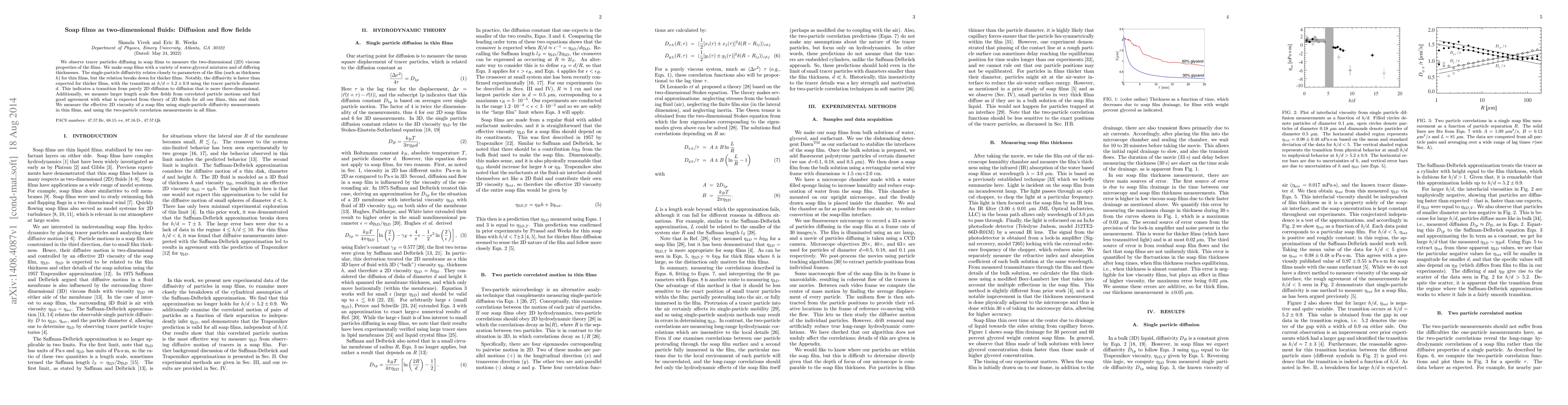 This study investigates the diffusion and flow fields in soap films using tracer particles, revealing that single-particle diffusivity correlates with film thickness in thin films but transitions to more three-dimensional behavior in thicker films at a critical thickness ratio. The effective 2D viscosity is measured, showing agreement with theoretical predictions for 2D fluid dynamics.