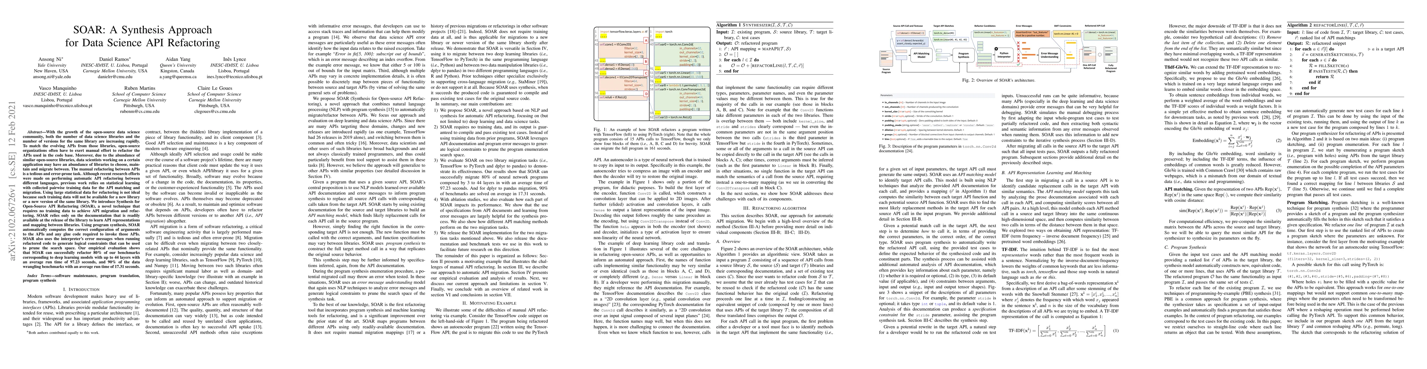 SOAR is a novel technique for automatic API refactoring in open-source data science libraries that does not require training data. It uses available documentation and program synthesis to generate the correct API configurations and glue code, achieving successful refactoring in 80% of deep learning benchmarks and 90% of data wrangling benchmarks.