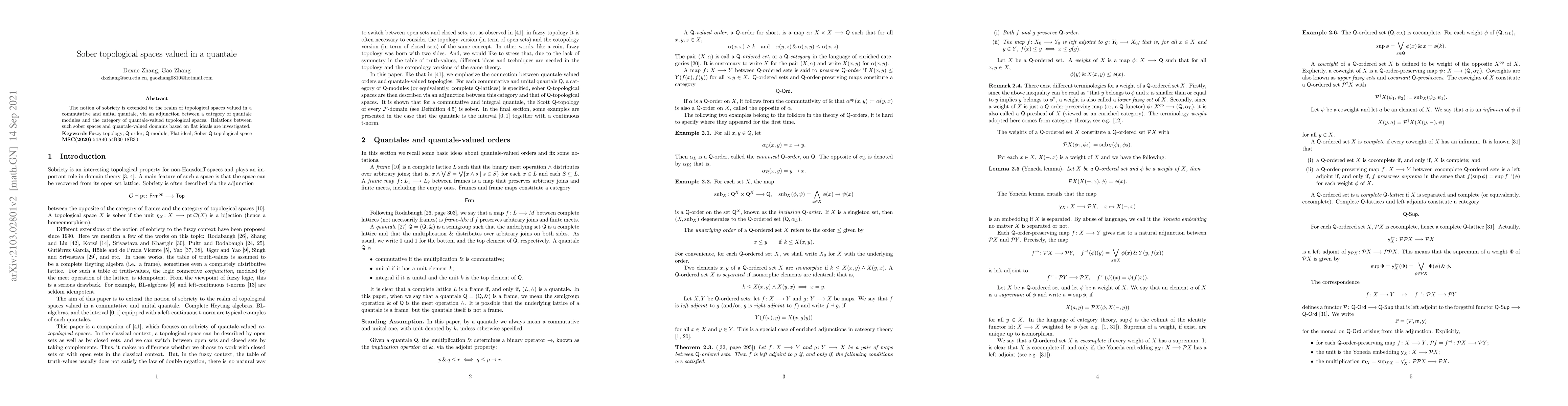 The paper extends the concept of sobriety to quantale-valued topological spaces using an adjunction between quantale modules and quantale-topological spaces, exploring connections to domains defined by flat ideals. Sober quantale-valued spaces are characterized through this adjunction framework.