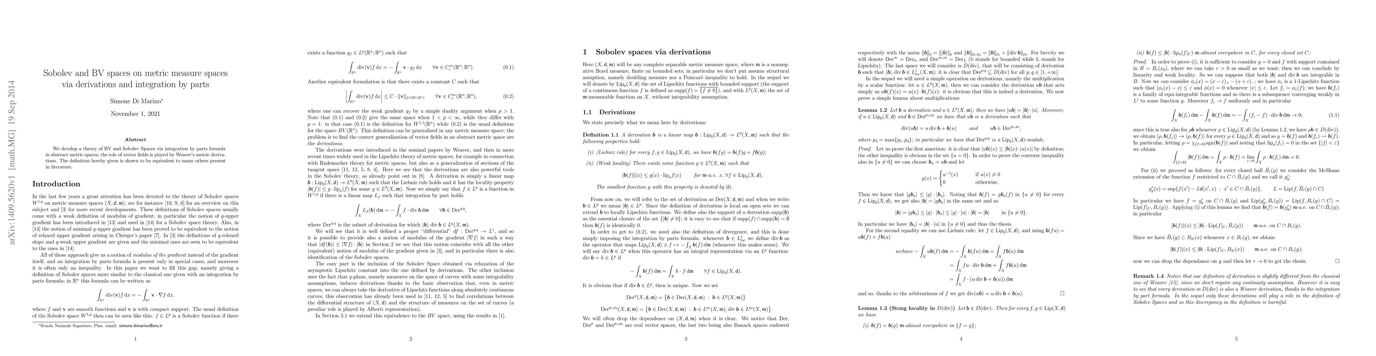 This paper develops a theory of BV and Sobolev spaces in abstract metric spaces using integration by parts and Weaver's metric derivations, demonstrating equivalence to existing definitions in the literature.