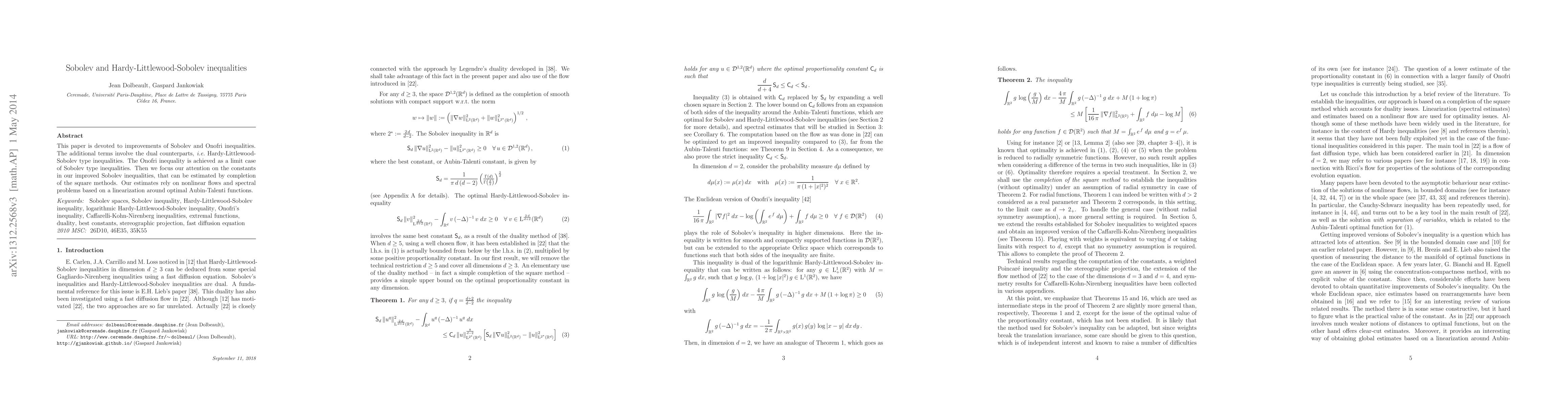 This paper improves Sobolev and Onofri inequalities by incorporating Hardy-Littlewood-Sobolev type inequalities. It also estimates the constants in the improved Sobolev inequalities using completion of the square methods based on nonlinear flows and spectral problems.