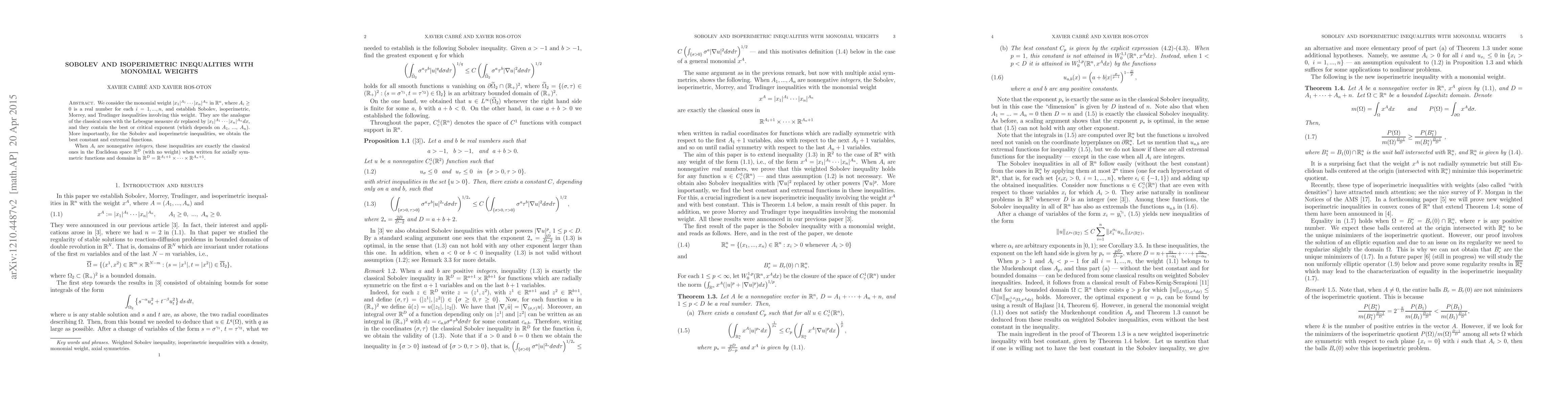 We consider the monomial weight $|x_1|^{A_1}...|x_n|^{A_n}$ in $\mathbb R^n$, where $A_i\geq0$ is a real number for each $i=1,...,n$, and establish Sobolev, isoperimetric, Morrey, and Trudinger inequalities involving this weight. They are the analogue of the classical ones with the Lebesgue measure $dx$ replaced by $|x_1|^{A_1}...|x_n|^{A_n}dx$, and they contain the best or critical exponent (which depends on $A_1$, ..., $A_n$). More importantly, for the Sobolev and isoperimetric inequalities, we obtain the best constant and extremal functions. When $A_i$ are nonnegative \textit{integers}, these inequalities are exactly the classical ones in the Euclidean space $\mathbb R^D$ (with no weight) when written for axially symmetric functions and domains in $\mathbb R^D=\mathbb R^{A_1+1}\times...\times\mathbb R^{A_n+1}$.