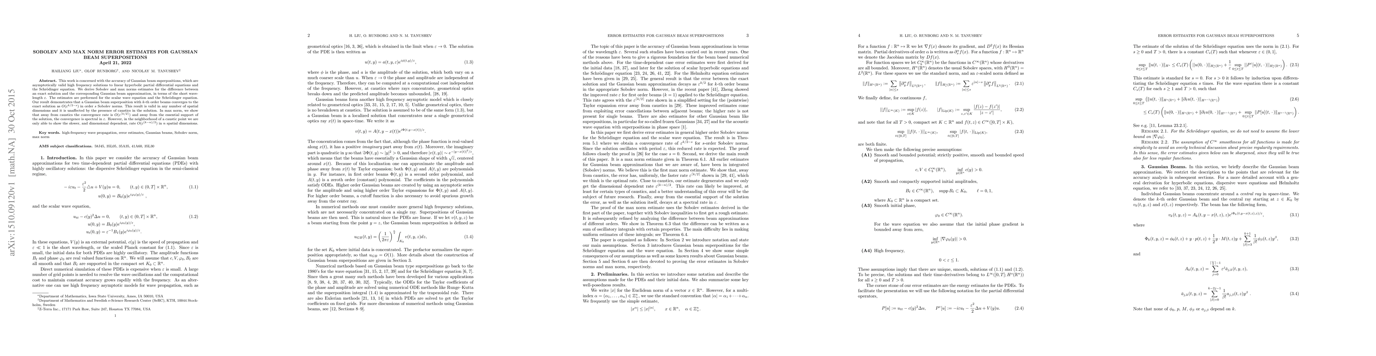 This paper provides Sobolev and max norm error estimates for Gaussian beam superpositions used to approximate high-frequency solutions to linear hyperbolic PDEs and the Schrödinger equation. The study shows that Gaussian beams converge to exact solutions at rates dependent on the beam order and spatial dimension, with notable differences in convergence near caustics.