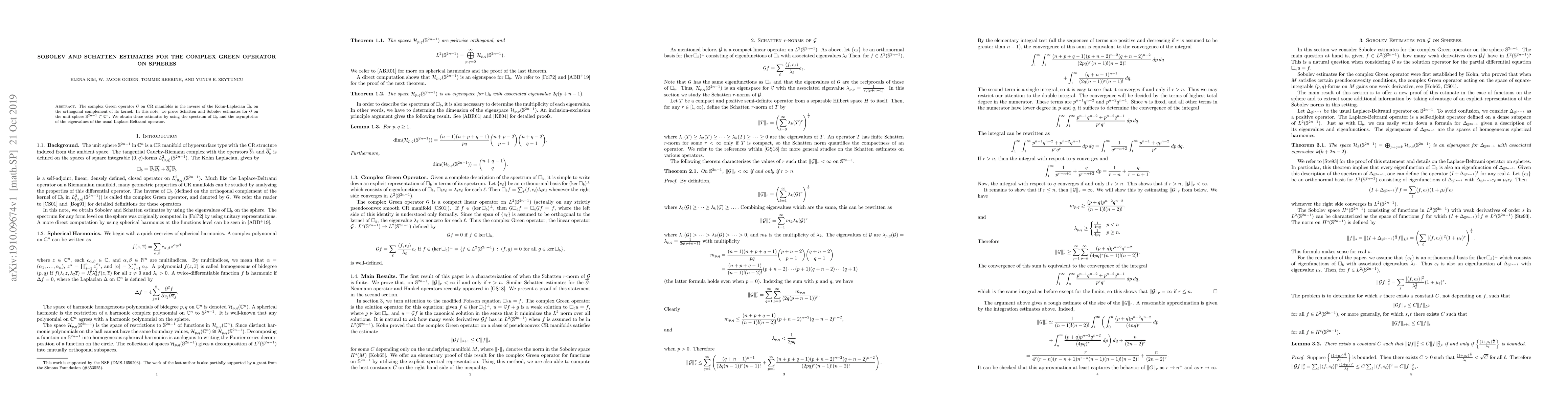 This paper proves Schatten and Sobolev estimates for the complex Green operator $\mathcal{G}$ on the unit sphere $\mathbb{S}^{2n-1}$, leveraging the spectrum of the Kohn-Laplacian $\square_b$ and the asymptotics of the Laplace-Beltrami operator's eigenvalues.