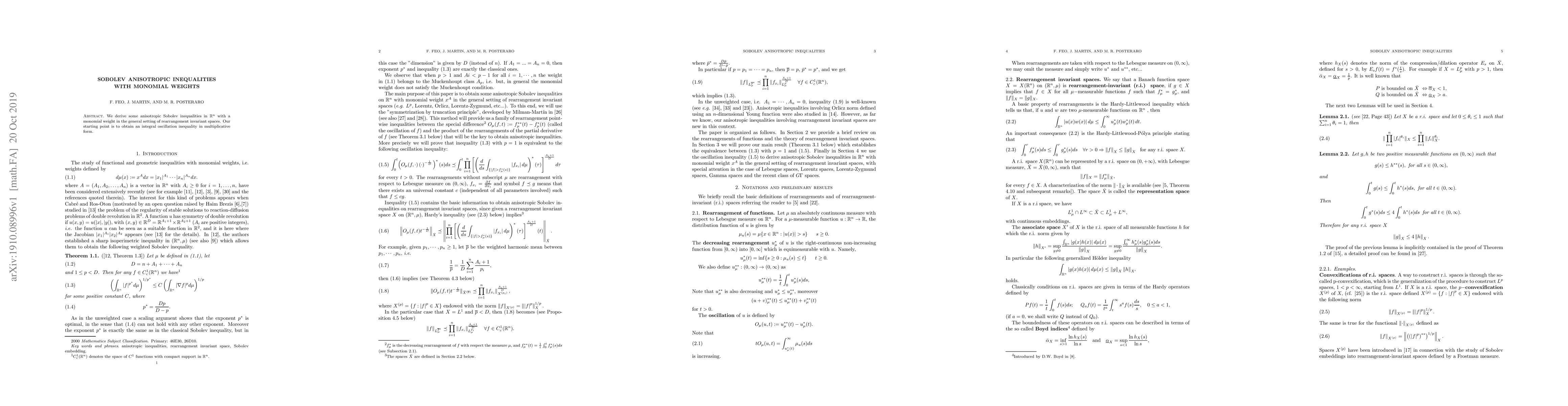This paper derives anisotropic Sobolev inequalities in $\mathbb{R}^{n}$ with monomial weights within the framework of rearrangement invariant spaces, establishing an integral oscillation inequality in multiplicative form as a foundational step.