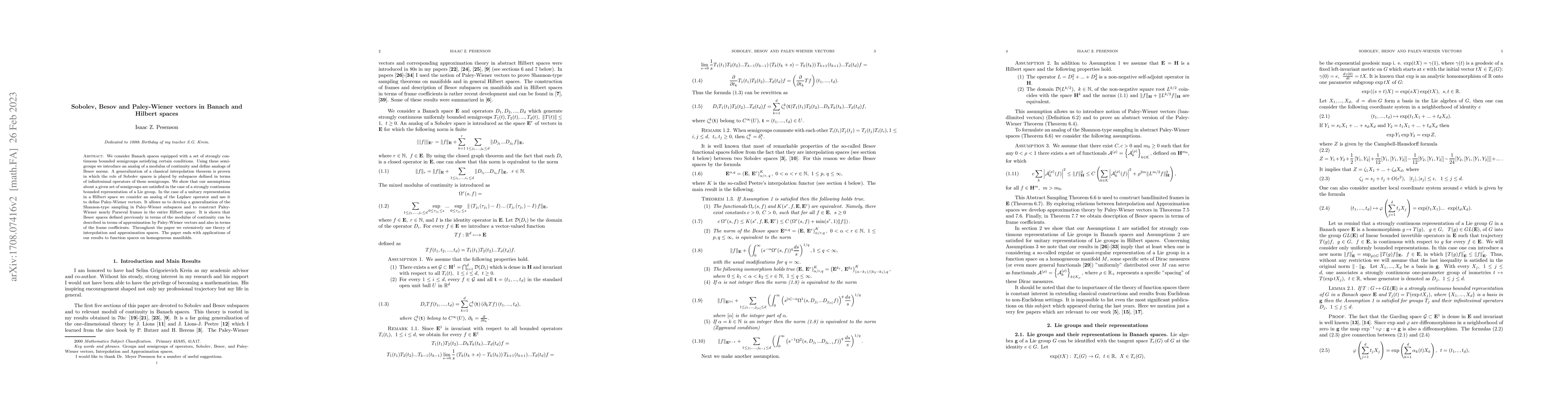 We consider Banach spaces equipped with a set of strongly continuous bounded semigroups satisfying certain conditions. Using these semigroups we introduce an analog of a modulus of continuity and define analogs of Besov norms. A generalization of a classical interpolation theorem is proven in which the role of Sobolev spaces is played by subspaces defined in terms of infinitesimal operators of these semigroups. We show that our assumptions about a given set of semigroups are satisfied in the case of a strongly continuous bounded representation of a Lie group. In the case of a unitary representation in a Hilbert space we consider an analog of the Laplace operator and use it to define Paley-Wiener vectors. It allows us to develop a generalization of the Shannon-type sampling in Paley-Wiener subspaces and to construct Paley-Wiener nearly Parseval frames in the entire Hilbert space. It is shown that Besov spaces defined previously in terms of the modulus of continuity can be described in terms of approximation by Paley-Wiener vectors and also in terms of the frame coefficients. Throughout the paper we extensively use theory of interpolation and approximation spaces. The paper ends with applications of our results to function spaces on homogeneous manifolds.