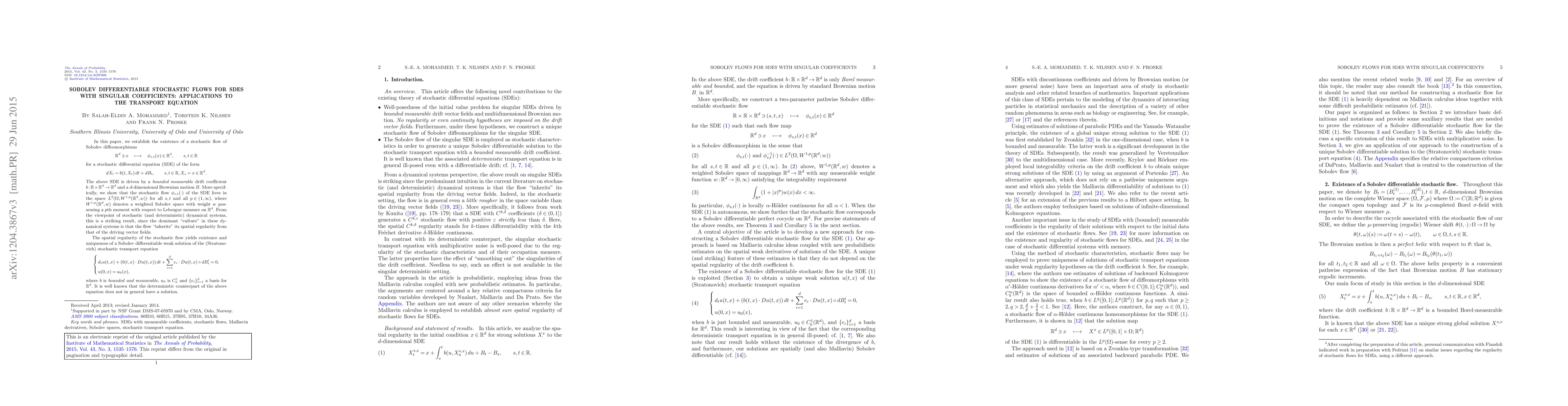 In this paper, we establish the existence of a stochastic flow of Sobolev diffeomorphisms \[\mathbb{R}^d\ni x\quad\longmapsto\quad\phi_{s,t}(x)\in \mathbb{R}^d,\qquad s,t\in\mathbb{R}\] for a stochastic differential equation (SDE) of the form \[dX_t=b(t,X_t)\,dt+dB_t,\qquad s,t\in\mathbb{R},X_s=x\in\mathbb{R}^d.\] The above SDE is driven by a bounded measurable drift coefficient $b:\mathbb{R}\times\mathbb{R}^d\rightarrow\mathbb{R}^d$ and a $d$-dimensional Brownian motion $B$. More specifically, we show that the stochastic flow $\phi_{s,t}(\cdot)$ of the SDE lives in the space $L^2(\Omega;W^{1,p}(\mathbb{R}^d,w))$ for all $s,t$ and all $p\in (1,\infty)$, where $W^{1,p}(\mathbb{R}^d,w)$ denotes a weighted Sobolev space with weight $w$ possessing a $p$th moment with respect to Lebesgue measure on $\mathbb {R}^d$. From the viewpoint of stochastic (and deterministic) dynamical systems, this is a striking result, since the dominant "culture" in these dynamical systems is that the flow "inherits" its spatial regularity from that of the driving vector fields. The spatial regularity of the stochastic flow yields existence and uniqueness of a Sobolev differentiable weak solution of the (Stratonovich) stochastic transport equation \[\cases{\displaystyle d_tu(t,x)+\bigl(b(t,x)\cdot Du(t,x)\bigr)\,dt+\sum_{i=1}^de_i\cdot Du(t,x)\circ dB_t^i=0,\cr u(0,x)=u_0(x),}\] where $b$ is bounded and measurable, $u_0$ is $C_b^1$ and $\{e_i\}_{i=1}^d$ a basis for $\mathbb{R}^d$. It is well known that the deterministic counterpart of the above equation does not in general have a solution.