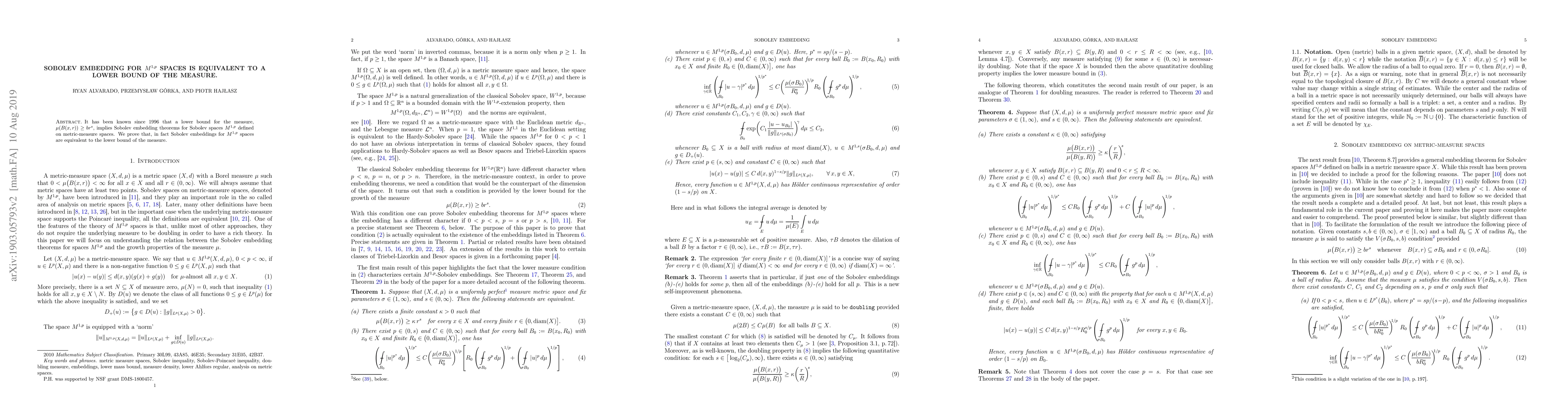 Sobolev embedding for $M^{1,p}$ spaces is equivalent to a lower bound of the measure $rac{ ext{$ ext{volume of ball} ext{(x,r)}$}{r^s}$, implying that these two concepts are interchangeable in this context.