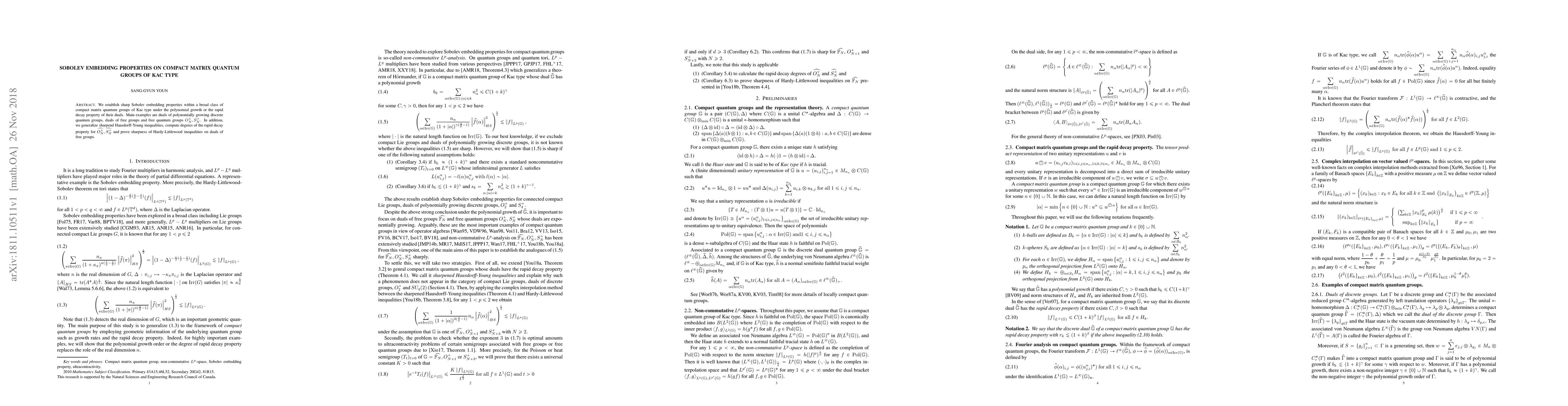 This paper establishes sharp Sobolev embedding properties for compact matrix quantum groups of Kac type, focusing on polynomial growth or rapid decay properties of their duals. It also generalizes Hausdorff-Young inequalities and proves the sharpness of Hardy-Littlewood inequalities on duals of free groups.