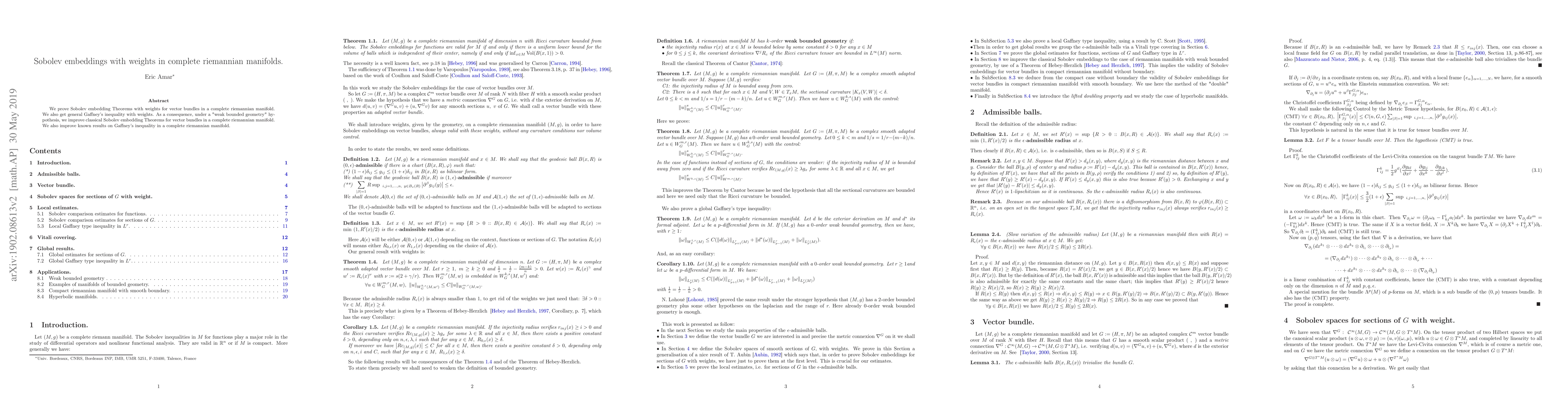 We prove Sobolev embedding Theorems with weights for vector bundles in a complete riemannian manifold. We also get general Gaffney's inequality with weights. As a consequence, under a "weak bounded geometry" hypothesis, we improve classical Sobolev embedding Theorems for vector bundles in a complete riemannian manifold. We also improve known results on Gaffney's inequality in a complete riemannian manifold.