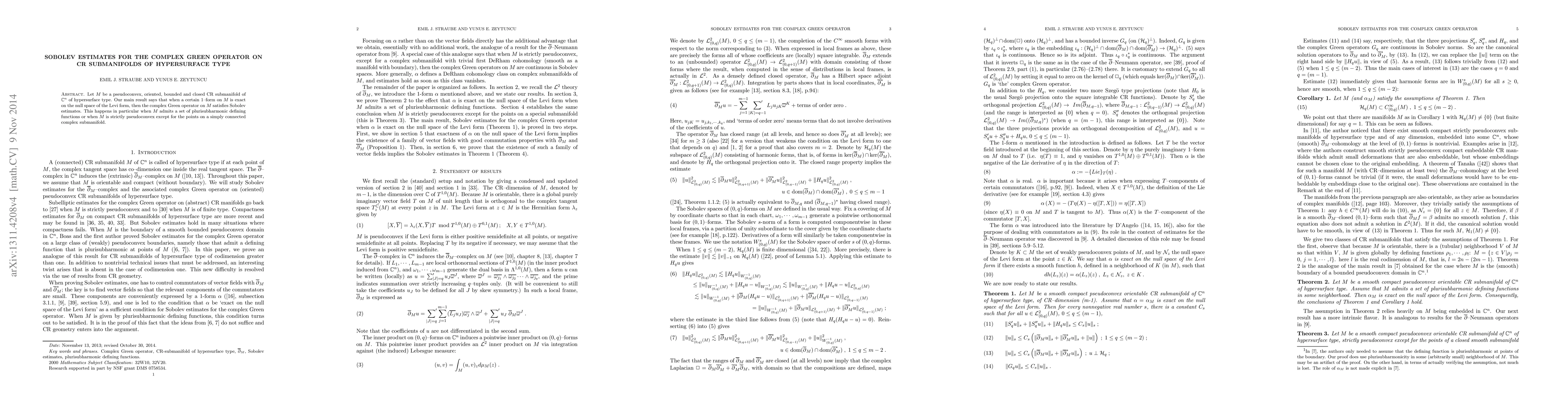 Summary: The paper establishes Sobolev estimates for the complex Green operator on pseudoconvex, bounded CR submanifolds of hypersurface type in $\mathbb{C}^{n}$, provided a specific $1$-form is exact on the null space of the Levi form, which holds under certain conditions like the existence of plurisubharmonic defining functions or strict pseudoconvexity except at points on a simply connected complex submanifold.