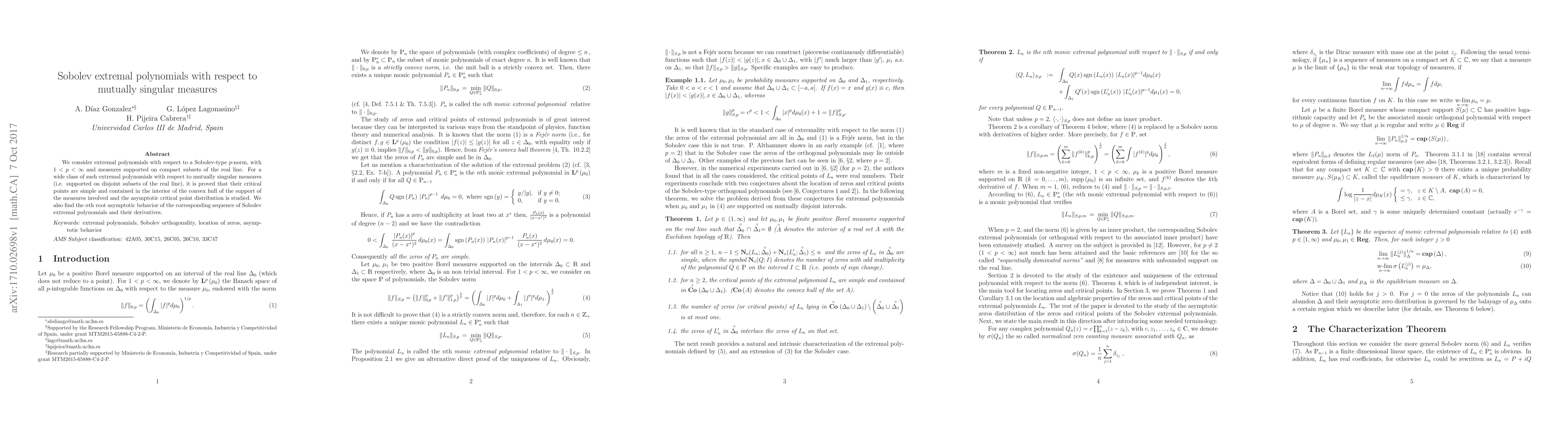 This paper studies extremal polynomials associated with Sobolev norms under mutually singular measures, proving that their critical points are simple and lie within the convex hull of the measures' supports. It also investigates the asymptotic distribution of these critical points and the $n$th root behavior of the corresponding polynomials and their derivatives.