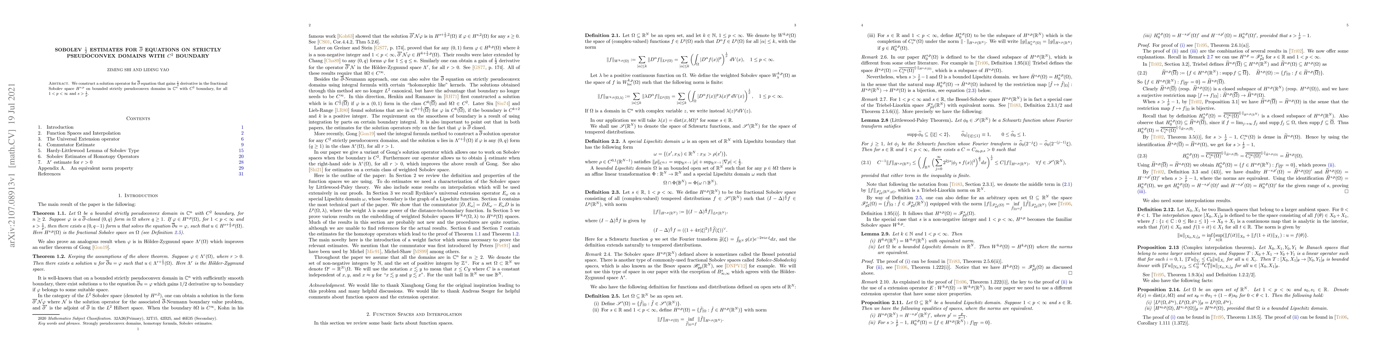 This paper constructs a solution operator for the $\overline{\partial}$ equation that achieves $\frac{1}{2}$ derivative improvement in fractional Sobolev spaces $H^{s,p}$ on strictly pseudoconvex domains with $C^2$ boundaries in $\mathbb{C}^n$. The results hold for all $1 < p < \infty$ and $s > \frac{1}{p}$.