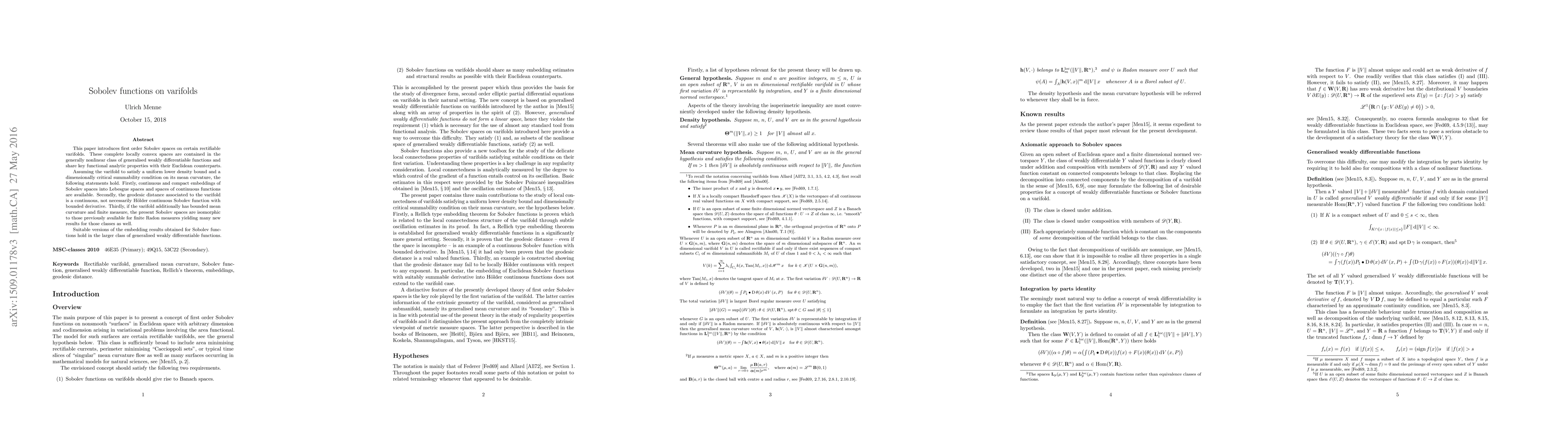 The paper introduces and analyzes first-order Sobolev spaces on rectifiable varifolds, proving embedding theorems and properties of the geodesic distance function, thereby linking Sobolev functions to generalised weakly differentiable functions.