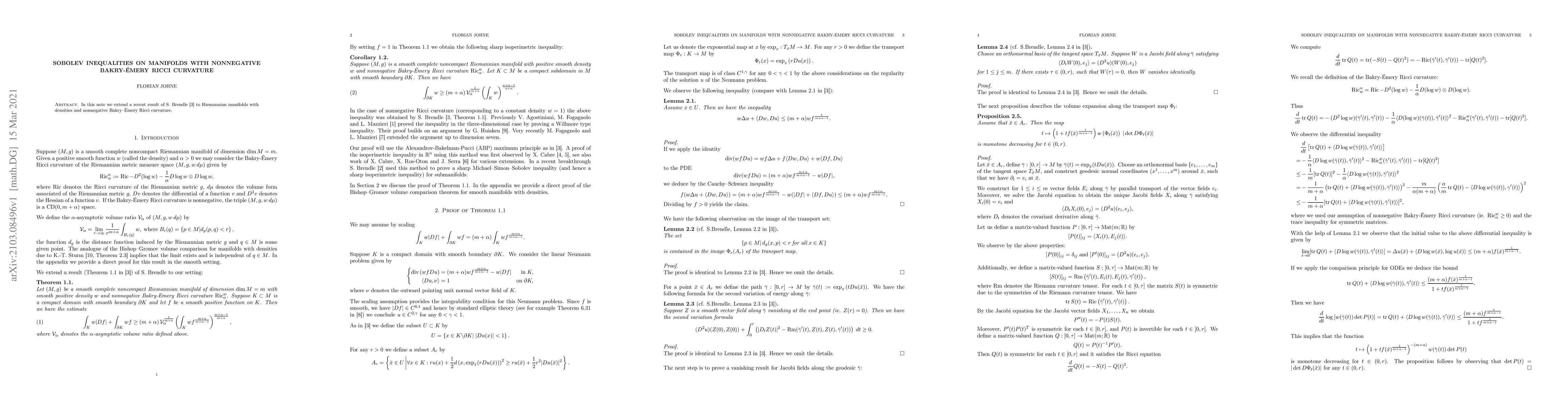 Summary: This paper extends Sobolev inequalities to Riemannian manifolds equipped with nonnegative Bakry-Émery Ricci curvature and density, building on the foundational work of Brendle. The result provides a significant advancement in understanding geometric analysis on such manifolds.