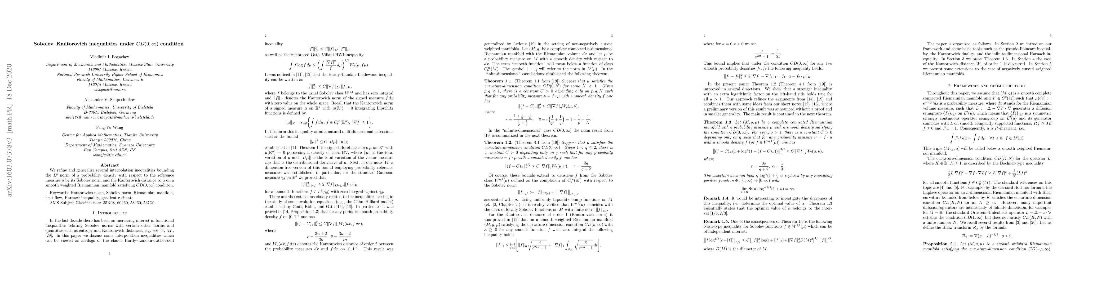This research paper refines interpolation inequalities for probability densities on smooth weighted Riemannian manifolds with a $CD(0, ty)$ condition, relating Sobolev norms to Kantorovich distances.