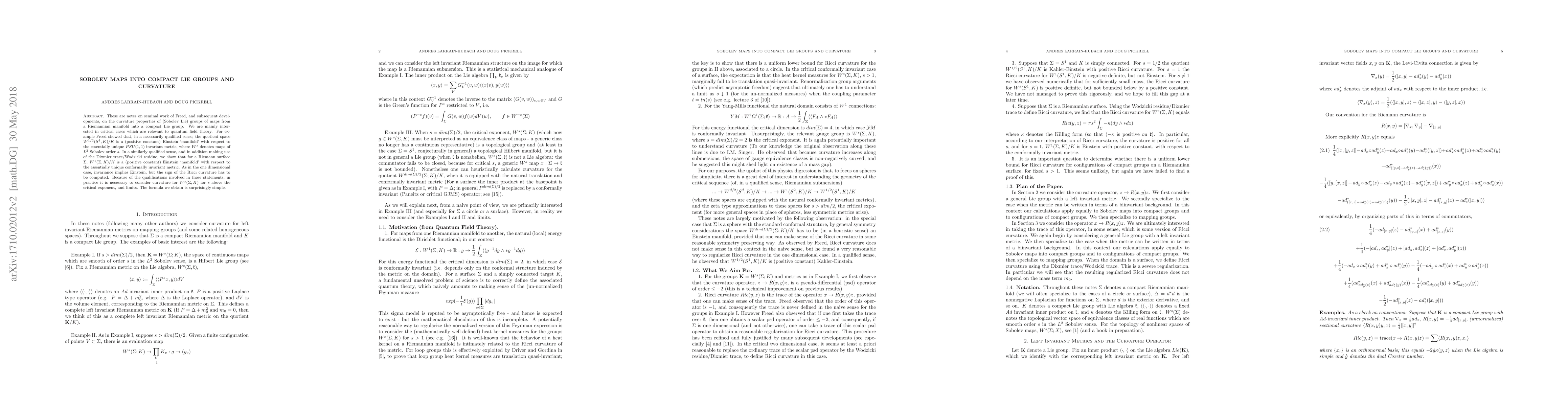 These are notes on seminal work of Freed, and subsequent developments, on the curvature properties of (Sobolev Lie) groups of maps from a Riemannian manifold into a compact Lie group. We are mainly interested in critical cases which are relevant to quantum field theory. For example Freed showed that, in a necessarily qualified sense, the quotient space $W^{1/2}(S^1,K)/K$ is a (positive constant) Einstein `manifold' with respect to the essentially unique PSU(1,1) invariant metric, where $W^{s}$ denotes maps of $L^2$ Sobolev order s. In a similarly qualified sense, and in addition making use of the Dixmier trace/Wodzicki residue, we show that for a Riemann surface Sigma, $W^1(\Sigma,K)/K$ is a (positive constant) Einstein `manifold' with respect to the essentially unique conformally invariant metric. As in the one dimensional case, invariance implies Einstein, but the sign of the Ricci curvature has to be computed. Because of the qualifications involved in these statements, in practice it is necessary to consider curvature for $W^s(\Sigma,K)$ for s above the critical exponent, and limits. The formula we obtain is surprisingly simple.