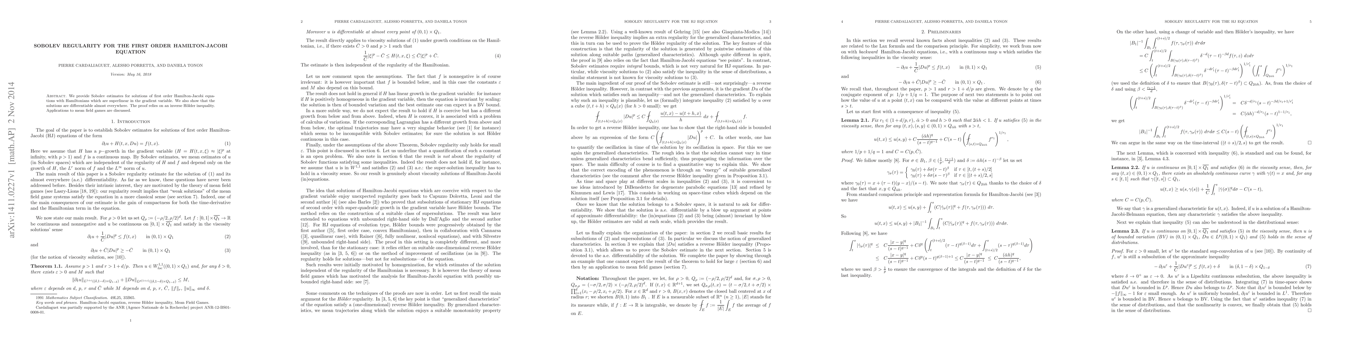 We provide Sobolev estimates for solutions of first order Hamilton-Jacobi equations with Hamiltonians which are superlinear in the gradient variable. We also show that the solutions are differentiable almost everywhere. The proof relies on an inverse H\"older inequality. Applications to mean field games are discussed.