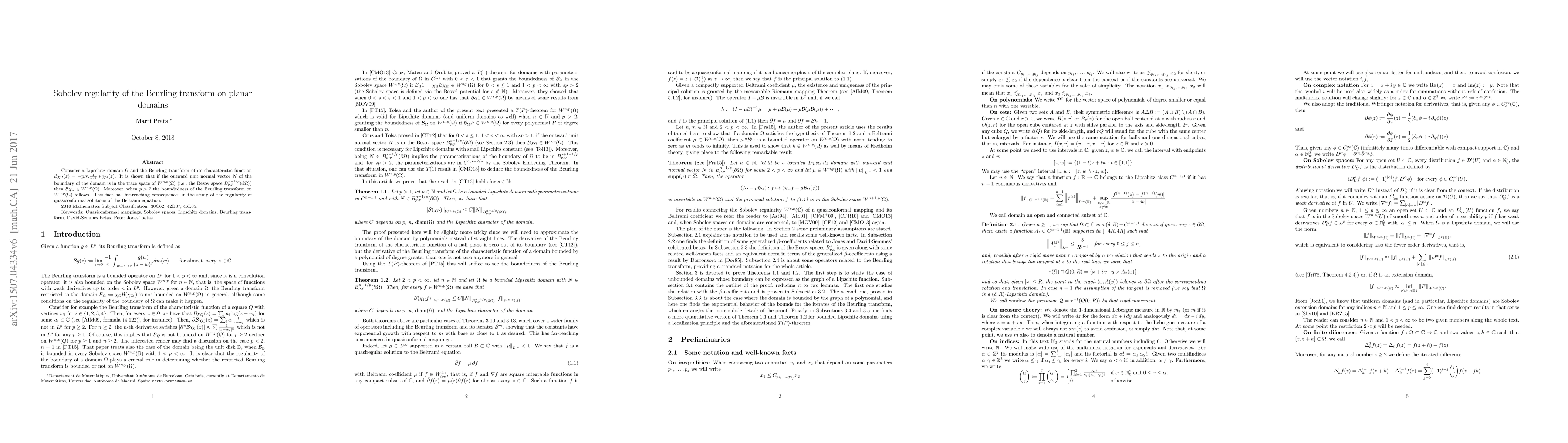 Consider a Lipschitz domain $\Omega$ and the Beurling transform of its characteristic function $\mathcal{B} \chi_\Omega(z)= - {\rm p.v.}\frac1{\pi z^2}*\chi_\Omega (z) $. It is shown that if the outward unit normal vector $N$ of the boundary of the domain is in the trace space of $W^{n,p}(\Omega)$ (i.e., the Besov space $B^{n-1/p}_{p,p}(\partial\Omega)$) then $\mathcal{B} \chi_\Omega \in W^{n,p}(\Omega)$. Moreover, when $p>2$ the boundedness of the Beurling transform on $W^{n,p}(\Omega)$ follows. This fact has far-reaching consequences in the study of the regularity of quasiconformal solutions of the Beltrami equation.